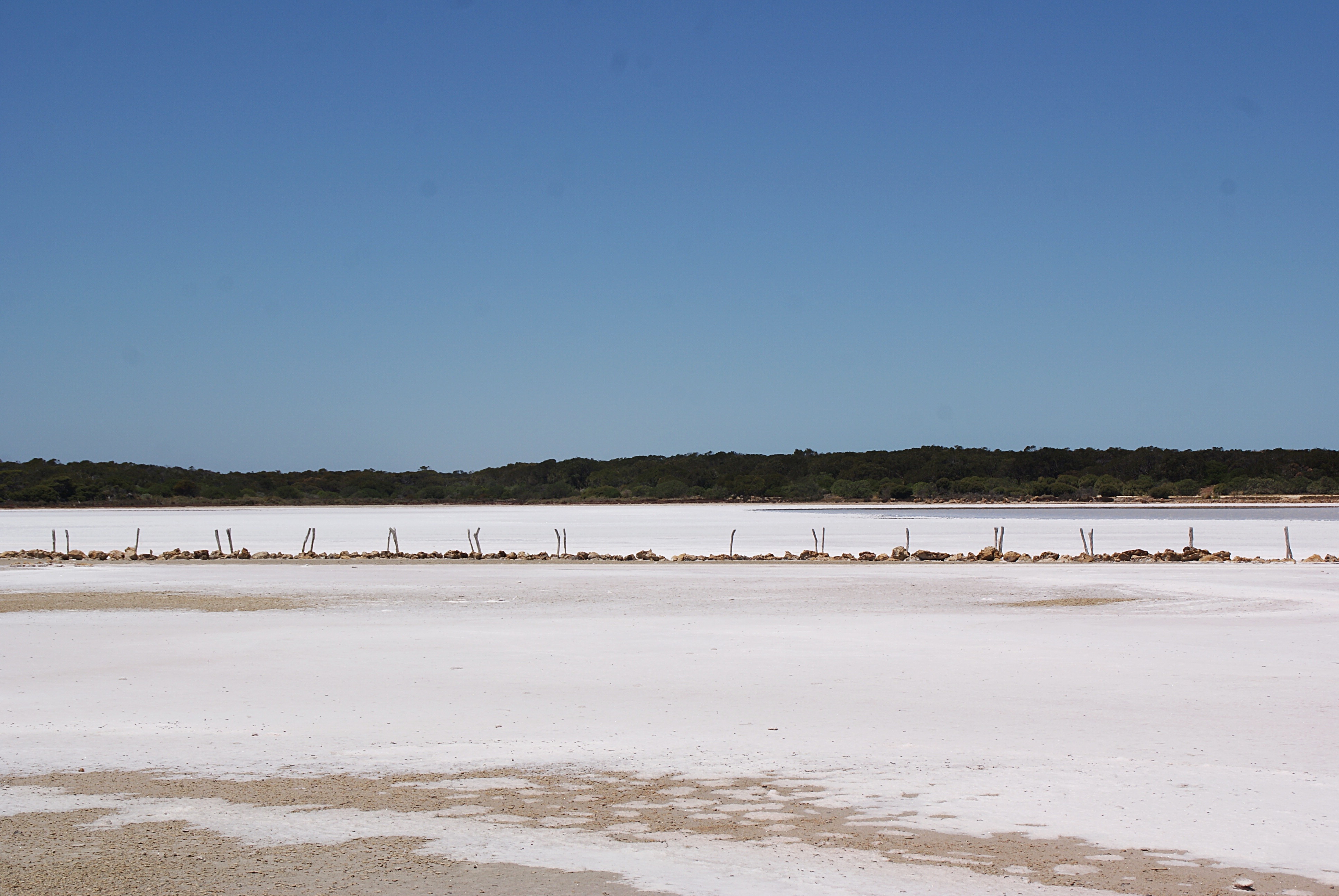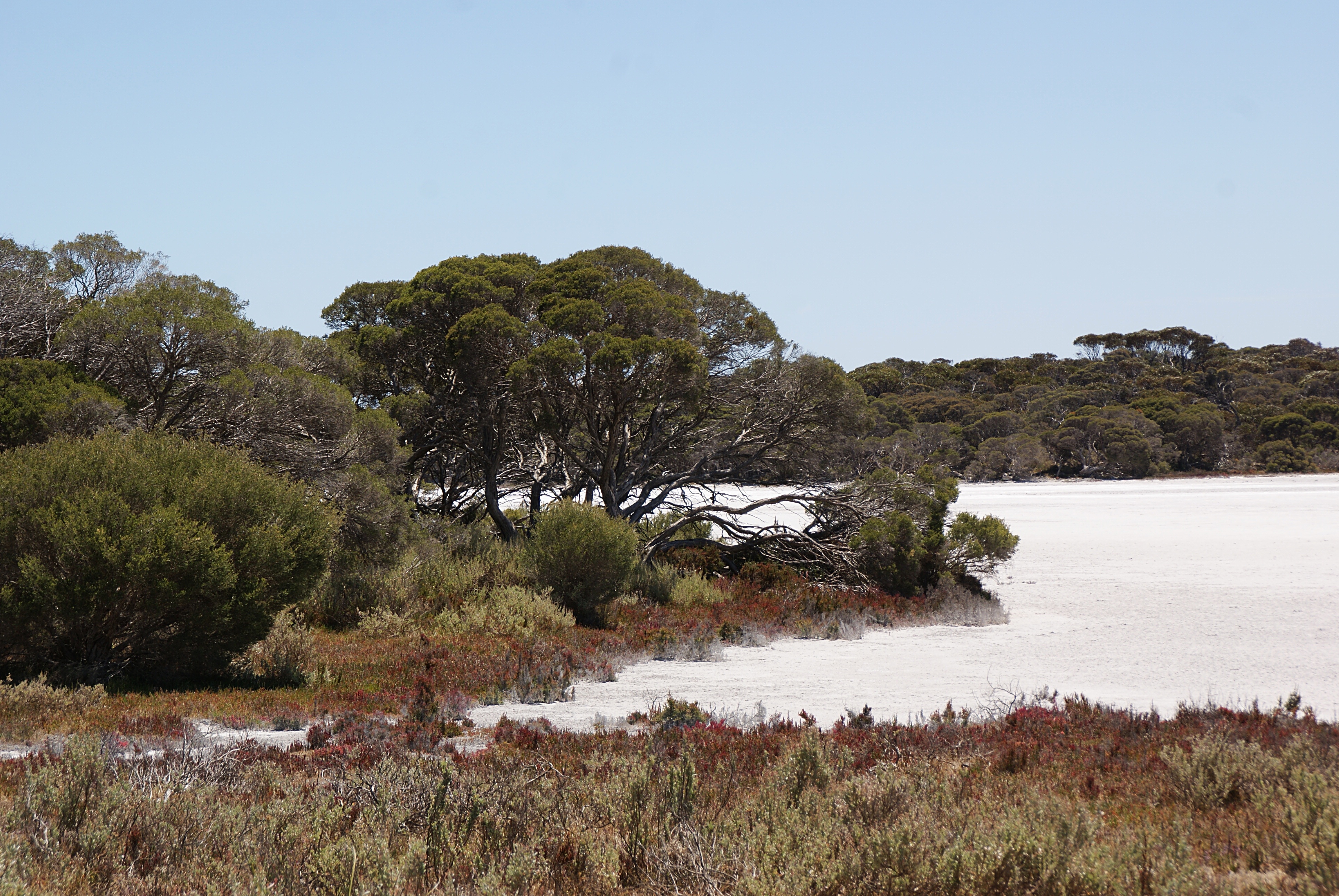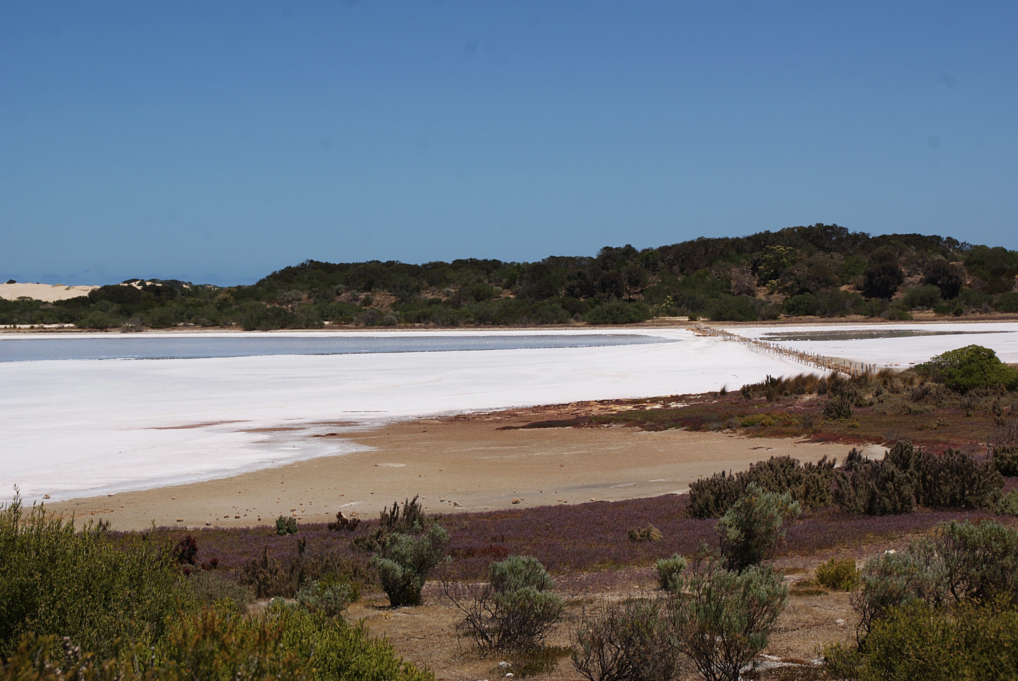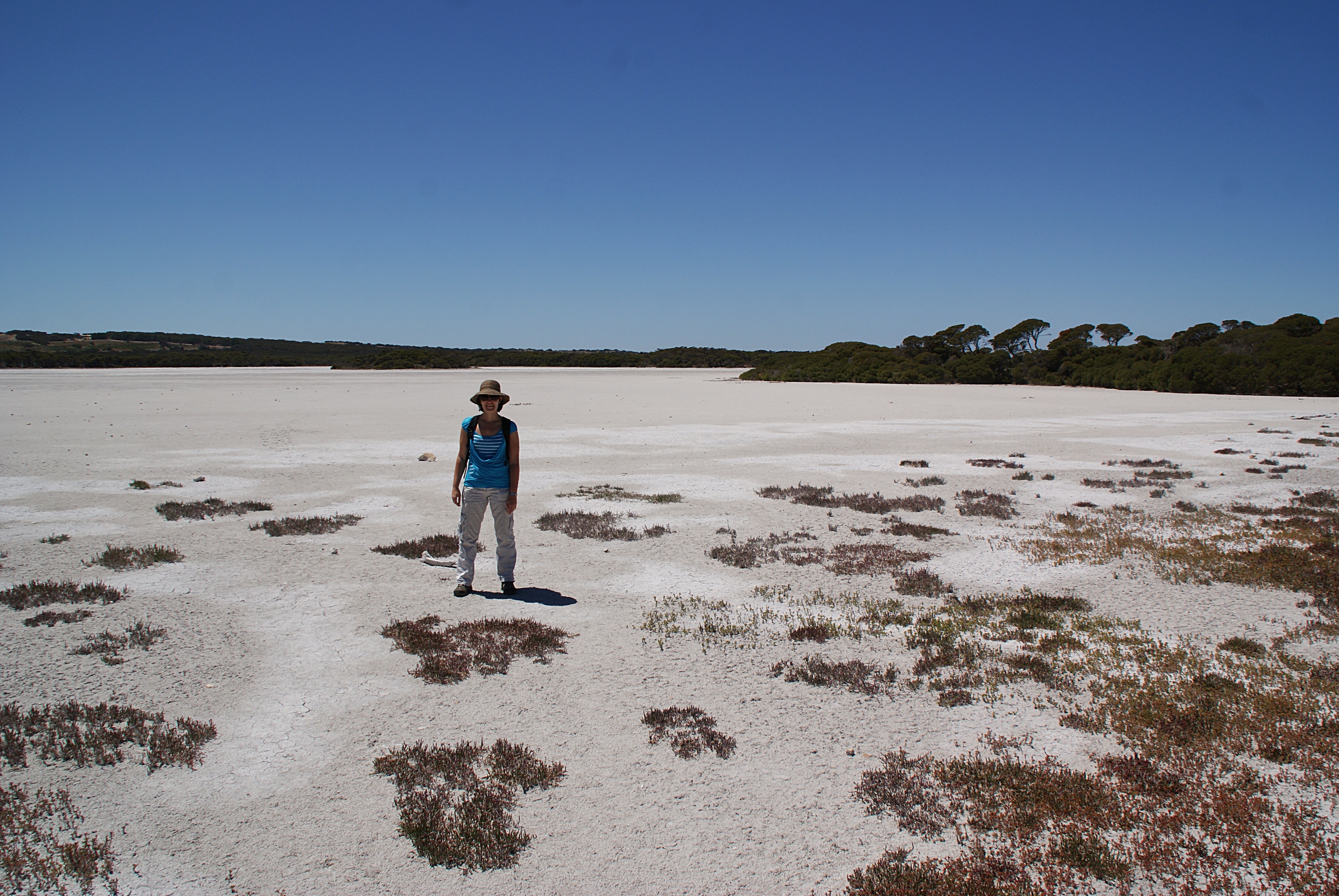Was auf den ersten Blick aussieht wie weißer Sand, ist also Salz. Nein, ich habe es nicht gekostet – spätestens als ich die vielen sich am Boden kringelnden weißen Würmer sah, war mir der Appetit darauf vergangen. Ein Foto eines solchen kann ich auf Wunsch gerne noch nachliefern ;-) Davon abgesehen eine tolle Location, die auf jedermanns South Australia-Reiseplan stehen sollte. Gestartet werden sollte der Rundweg wegen Schlangengefahr aber nur mit festen Schuhen. Wir haben Gott sei Dank keine getroffen, sondern nur eine Echse.