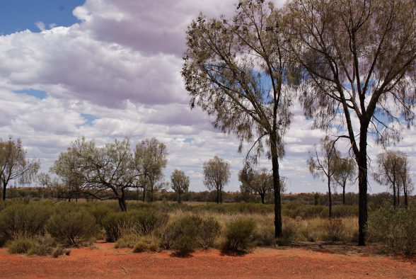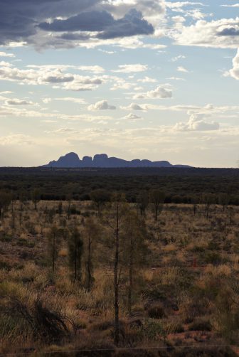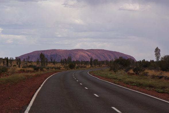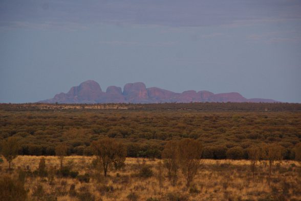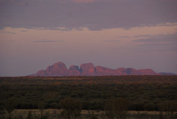 Unser neuer fahrbarer Untersatz stand schon bereit und war Gott sei Dank mit einer funktionierenden Klimaanlage ausgestattet, denn außerhalb der Flughafentüren erwartete uns eine trockene Hitze mit Temperaturen von mehr als 40 °C *schwitz*. Pukulpa pitjama Ananguku ngurakutu – Willkommen im Anangu-Land, sag ich da nur:-) Wir machten uns auf den kurzen Weg ins Ayers Rock Resort und staunten über die endlose Weite und die rotbraune Erde. Nach einer Verschnaufpause in unserem Bungalow-Viertel deckten wir uns im Supermarkt mit Proviant ein. Am Abend erhaschten wir noch einen ersten Blick vom Resortgelände aus auf den Uluru und die Kata Tjuta, bevor ein kleines Unwetter aufzog.