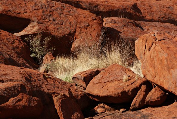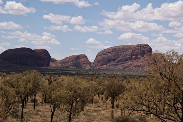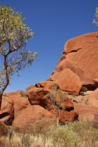 Aber der Tag war ja noch lang … wir lösten ein 3-Tages-Ticket für den Nationalpark und fuhren zu den Kata Tjuta. Der Name stammt von den Anangu (= Stamm der Aborigines) und bedeutet ‚viele Köpfe‘. Diese Ansammlung von 36 Felskuppeln erstreckt sich über 35 km; der höchste Fels ist 546 m hoch. Das Tal der Winde machte seinem Namen keine Ehre und so konnte ich aufgrund der Hitze leider nicht mehr den ganzen Weg erkunden, aber trotzdem war ich stark beeindruckt von den Olgas (wie die Kata Tjuta noch genannt werden).