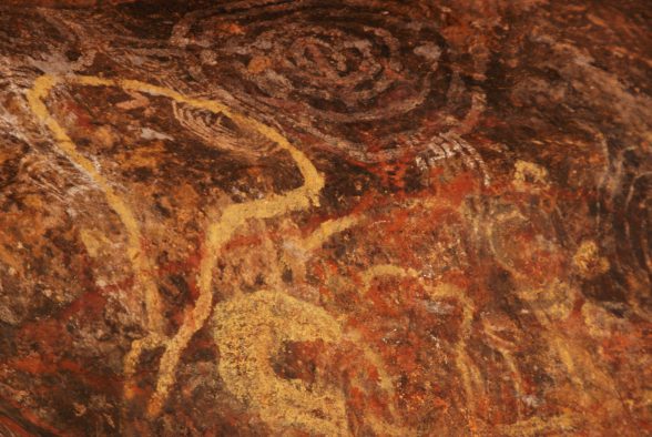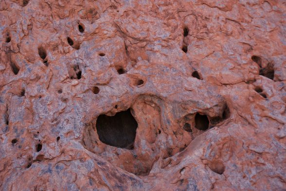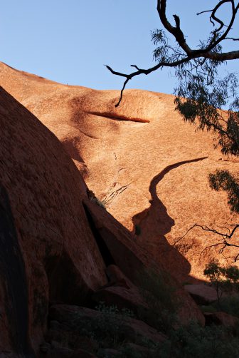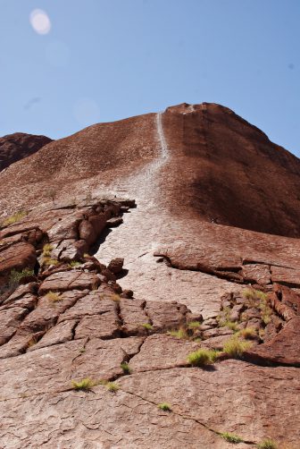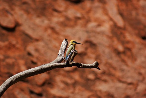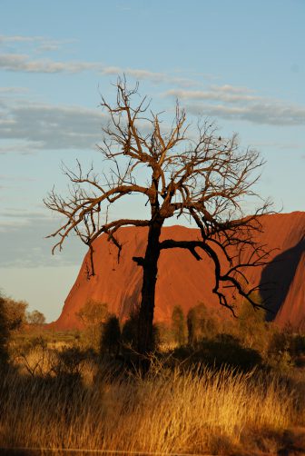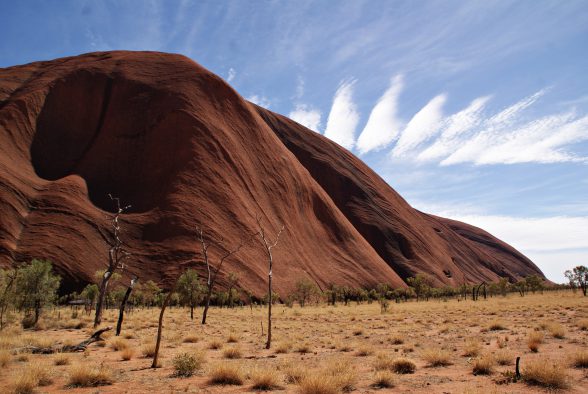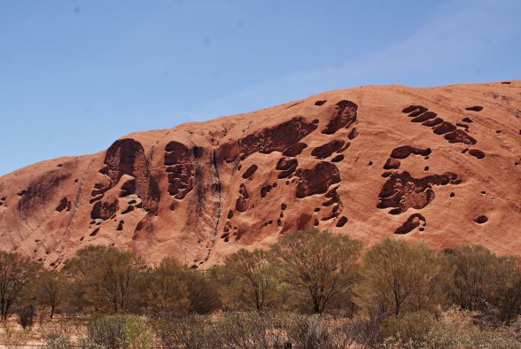 Danach erwanderten wir gemeinsam mit einem Ranger beim Mala Walk (kostenlos!) einen Teil des 9,4 km langen Rundweges um den Berg herum. Und nein, den Berg selbst haben wir nicht erklommen. Wir respektierten den Wunsch der Aborigines und stiegen nicht auf ihren heiligen Berg hinauf. Abgesehen davon brütete die Hitze auch an diesem Tag und hatten wir bereits um 5:15 Uhr in der Früh 32 °C. Stattdessen fuhren wir die um den Berg herumführende Straße ab, wanderten zum Mutitjulu Waterhole und besuchten das Cultural Centre. Bevor es wieder zum Flughafen ging, probierten wir ein Kängurufleisch .. und sorry, liebe Kängurus, aber es war verdammt gut *yammi*