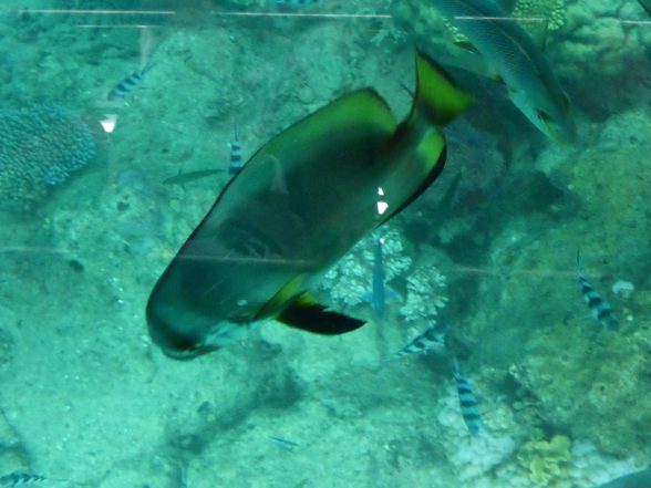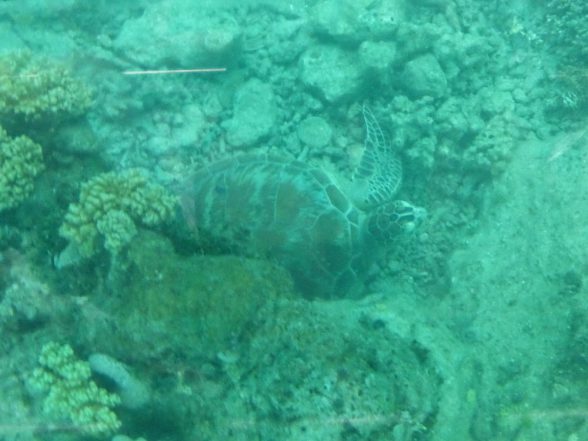 Auf Green Island angekommen stapften wir los, suchten schnell einen Spind, zogen uns um und ab ins Meer … dass es immer noch regnete, war zwar nicht so toll, aber beim Schnorcheln wird man sowieso nass .. nichts konnte mich mehr aufhalten, Unterwasserkamera umgebunden und geschnorchelt wird … aber hey, was ist denn hier los? Das konnte doch nicht sein, außer einem Fischi und viel Seegras war da nix, absolut nix. Aus der Traum … :-( Wir hatten nicht die Zeit, uns noch einen anderen Platz zu suchen, weil bereits die Fahrt mit dem Glasbodenboot losging. Dort bekamen wir dann doch noch kurz die Gelegenheit, bunte Korallen und Fische zu sehen … und als versöhnlichen Ausgang entdeckten wir sogar ein paar Schildkröten *freu* Dann ging es auch schon wieder zurück auf’s Boot.
