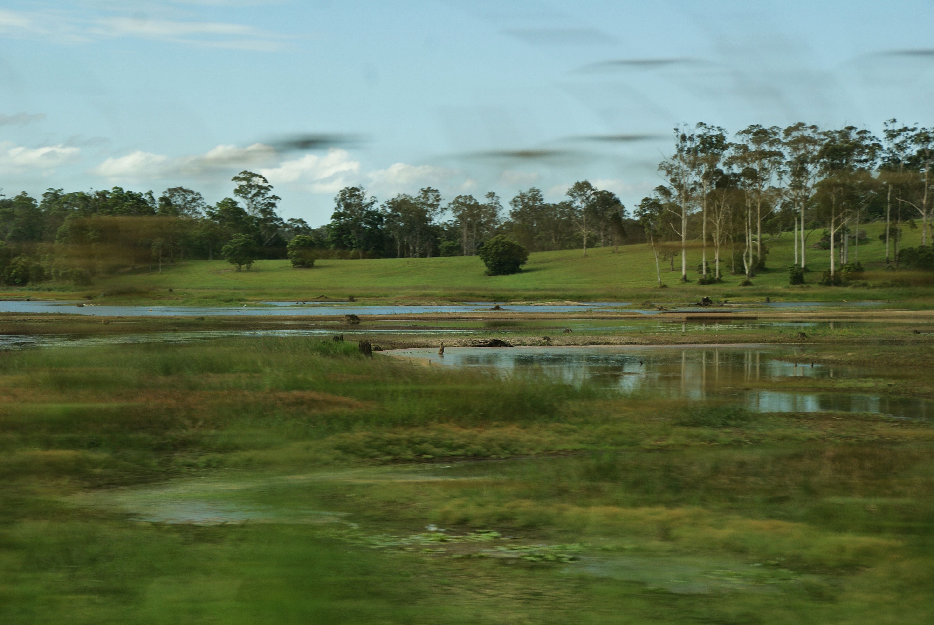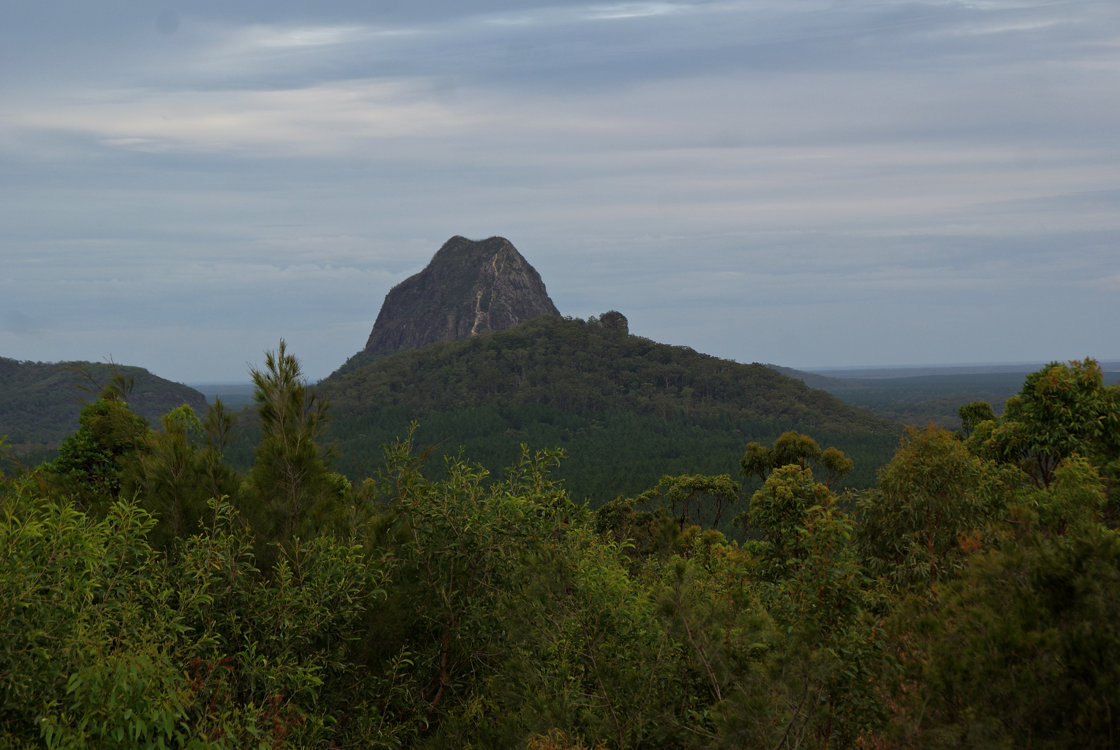 Bevor wir uns sputeten, zur Autovermietung in Brisbane zu kommen, ging es noch auf einen kleinen Abstecher zu den Glass House Mountains (Titelbild), 12 bis zu 27 Mio. Jahre alte Vulkanhügel. Captain Cook verpasste ihnen diesen Namen, weil sie ihn an die Glasbrennöfen in der Heimat erinnerten; für die Kabi-Aborigines hingegen stellt jede der Felsnadeln ein Mitglied einer zerstrittenen Berggeister-Familie dar: Mama Beerwah ist mit 555 m die größte, Coonowrin (oder auch Crookneck genannt, lässt den Kopf hängen, 377 m), Tibrogargan (364 m), die Zwillinge Tunbubudla (312 + 293 m), Beerburrum (276 m), Ngungun (253 m), Coochin (253 m), Tibberoowuccum (220 m), Miketeebumulgrai (199 m), Elimbah (129 m) und Wild Horse Mountain (Round Mountain, 123 m). Im 8,8 km² großen Nationalpark gibt es einige Wanderwege und andere Sportmöglichkeiten; wir beschränkten uns jedoch darauf, die Aussicht von der Plattform aus auf uns wirken zu lassen.