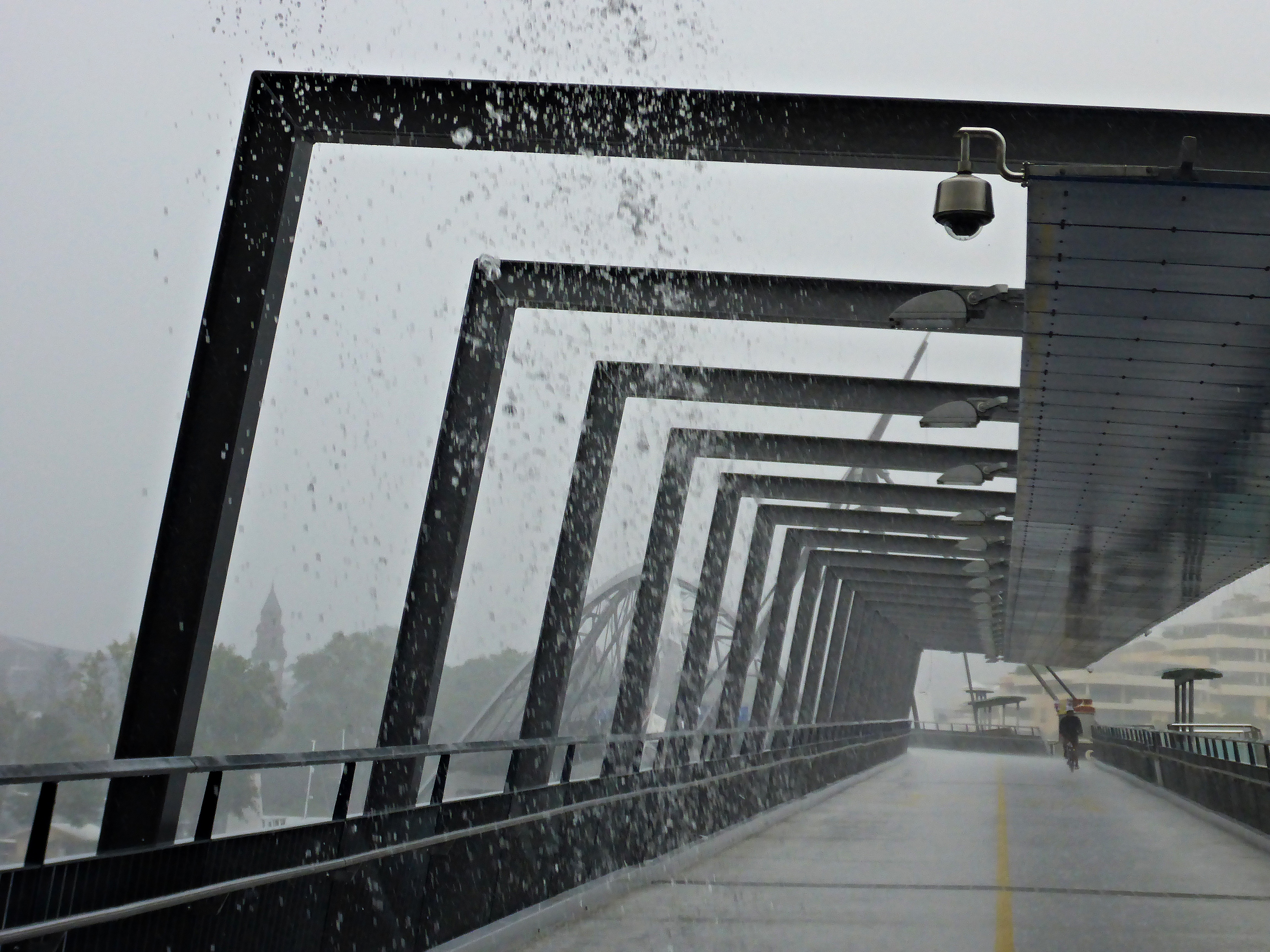 Beim Überqueren der Fußgänger- und Radfahrbrücke „Goodwill Bridge“ erwischte uns ein länger andauernder Wolkenbruch, weshalb ich mich zum ersten Mal in meinem Leben ausführlichst mit der Architektur eines Brückenpfeilers beschäftigt habe ;-)