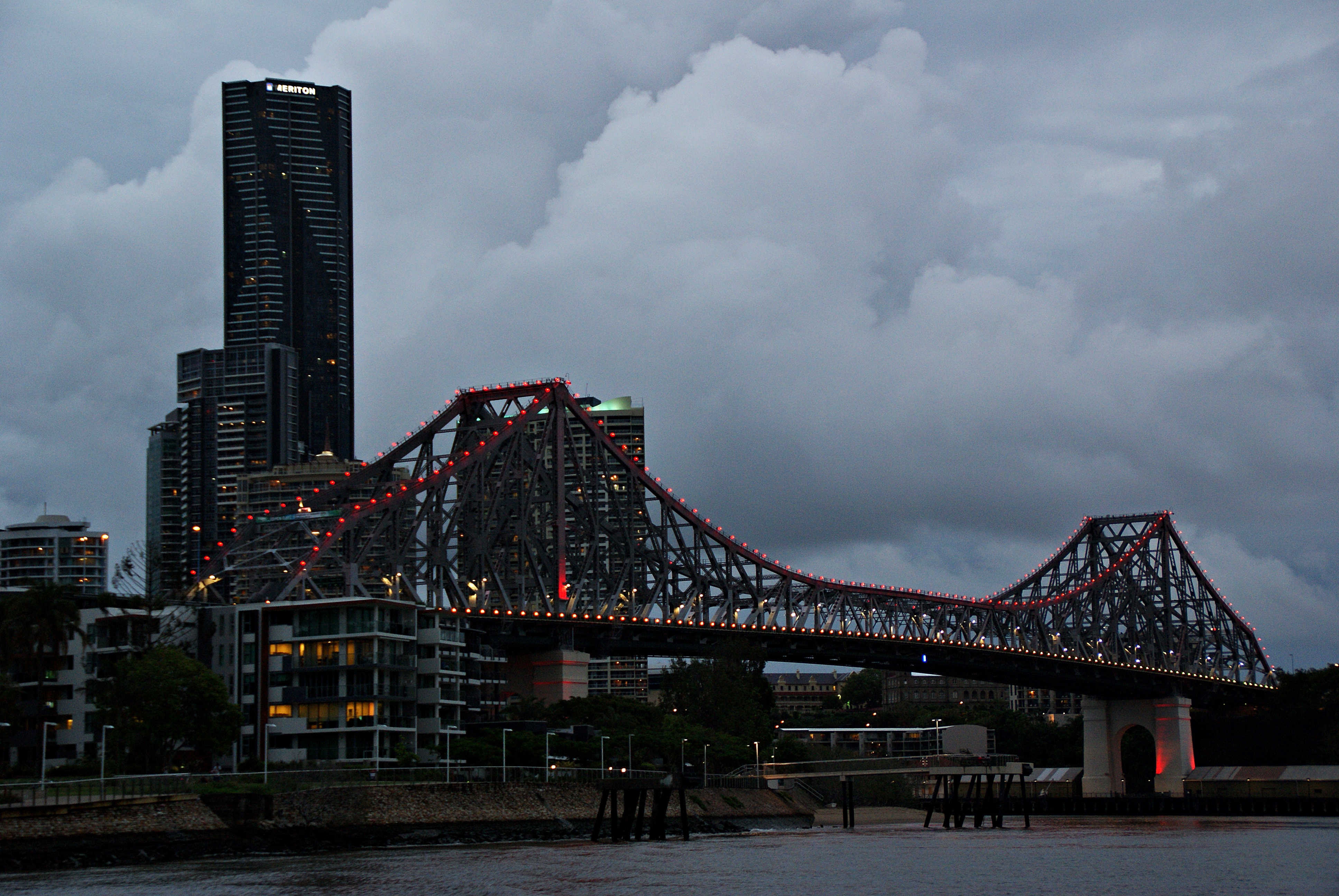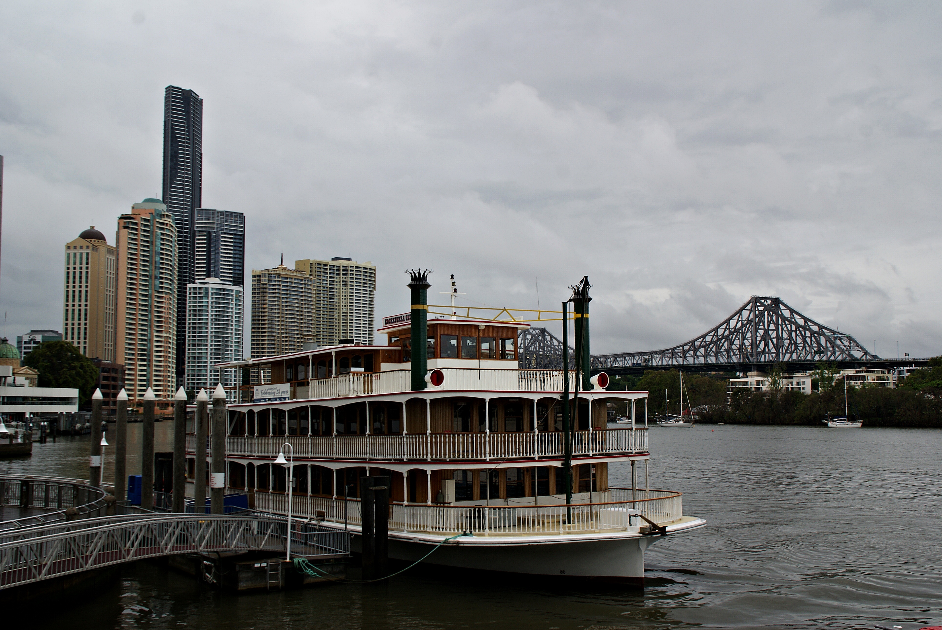 Der Schaufelraddampfer machte an dem Tag leider Urlaub, weshalb wir stattdessen erst eine Runde mit dem Gratis-Loopbus drehten und dann vom North Quay aus mit dem RED City Hopper (kostenlose Fähre) bis Sydney Street und zurück bis Holman Street fuhren – ein wunderbarer Blick auf den Sonnenuntergang, die Skyline von Brisbane und die Story Bridge waren inklusive. Schließlich spazierten wir über die Story Bridge zurück zur Unterkunft … die Brücke kann übrigens im Rahmen einer geführten Tour erklettert werden.