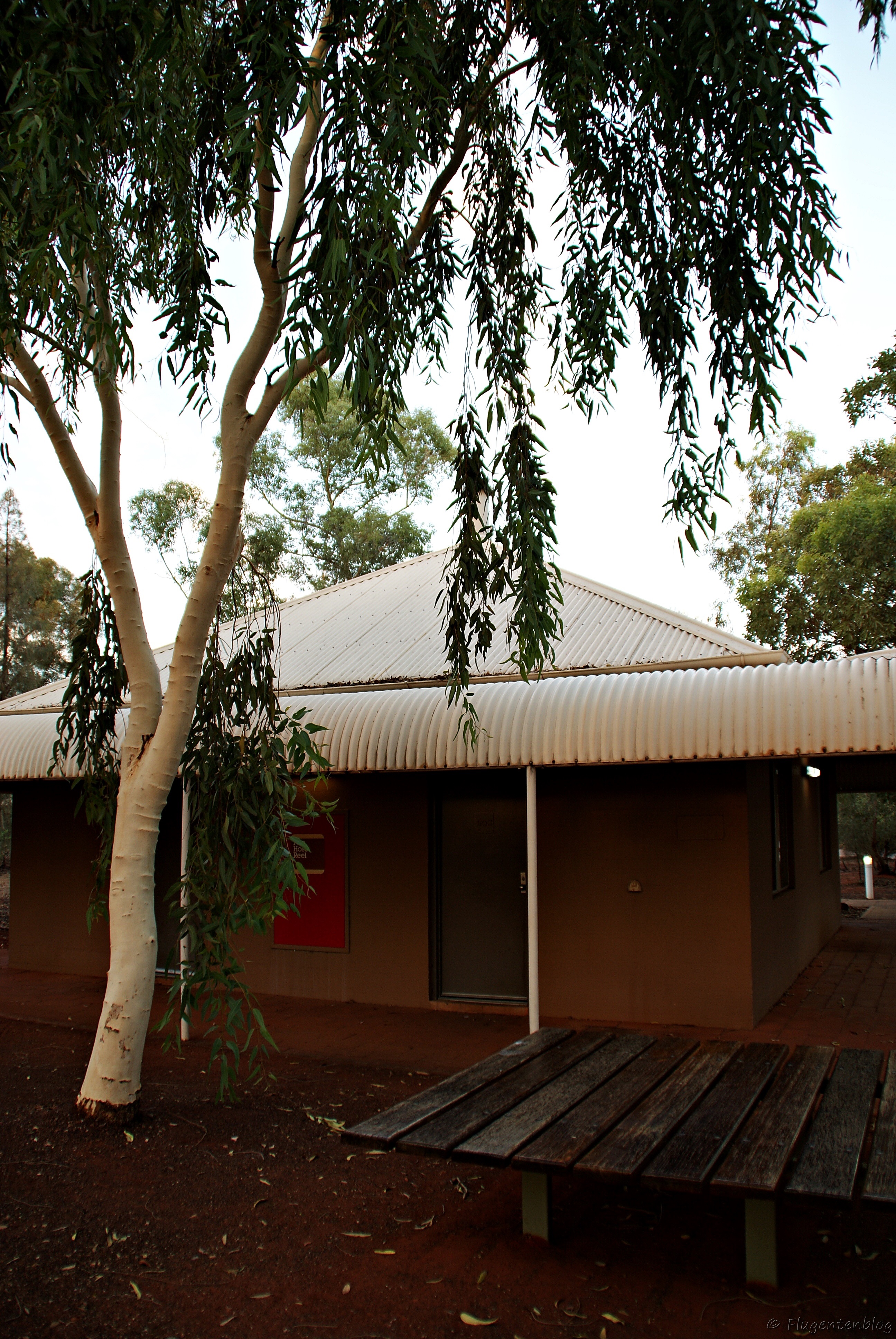 Ayers Rock: Hostel Outback Pioneer Lodge – unsere teuerste Unterkunft in Australien. In unserem Bungalow-Viertel war es aber bequem und gut gekühlt (bei 44 °C Tageshöchsttemperatur ist das nicht ganz unwesentlich). Gemeinschaftsbad und -wc nach Männlein und Weiblein getrennt. Zusätzlich gibt es eine Snackbar (unbedingt den Känguru-Wrap probieren!), ein Restaurant und einen Pool.