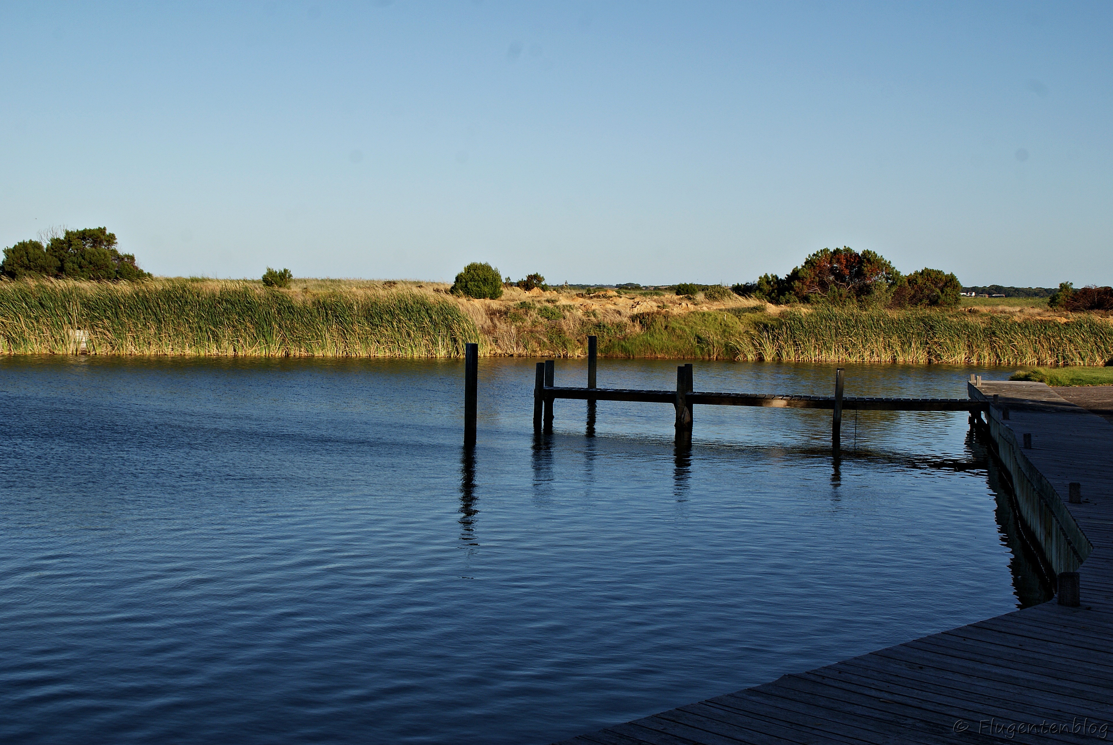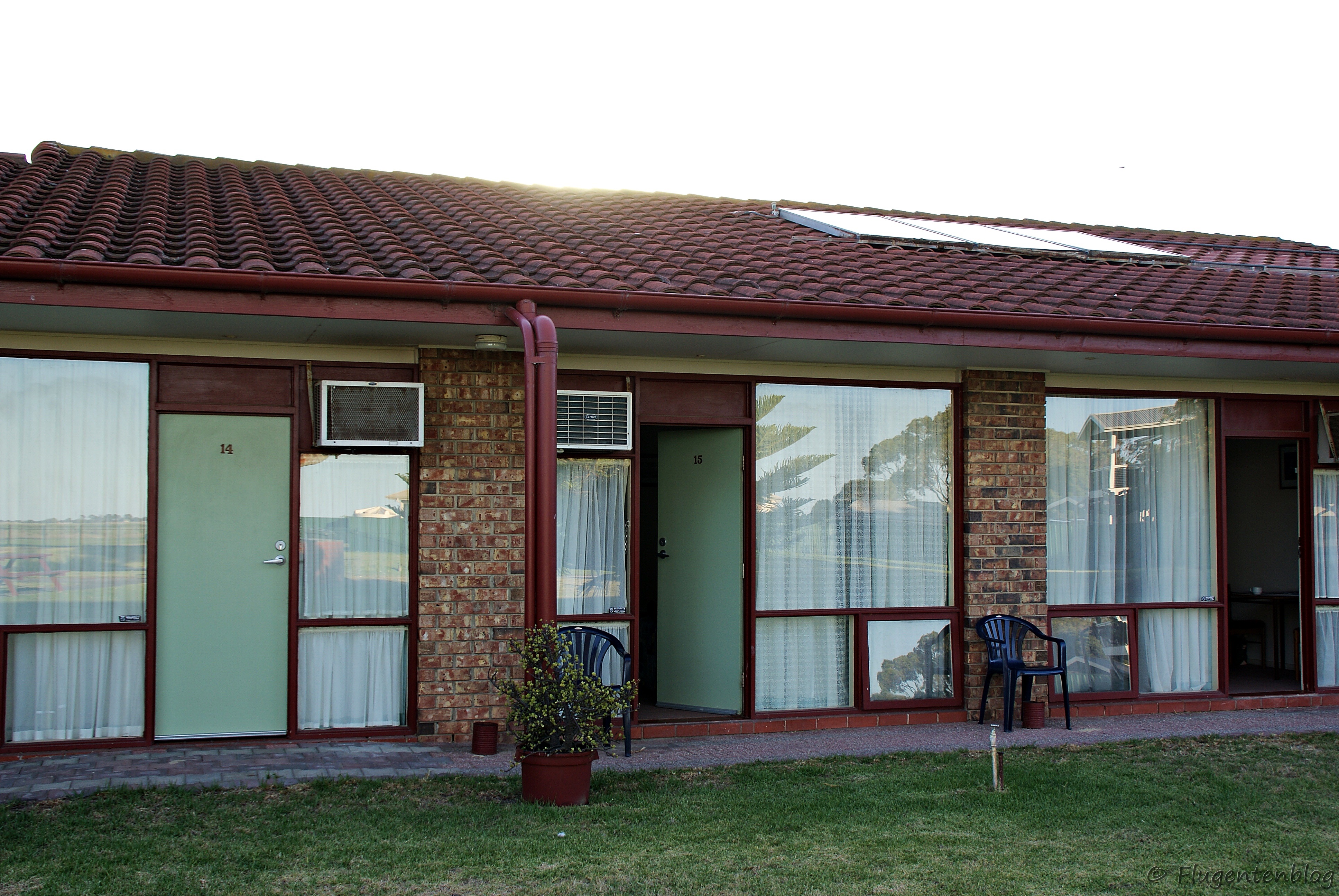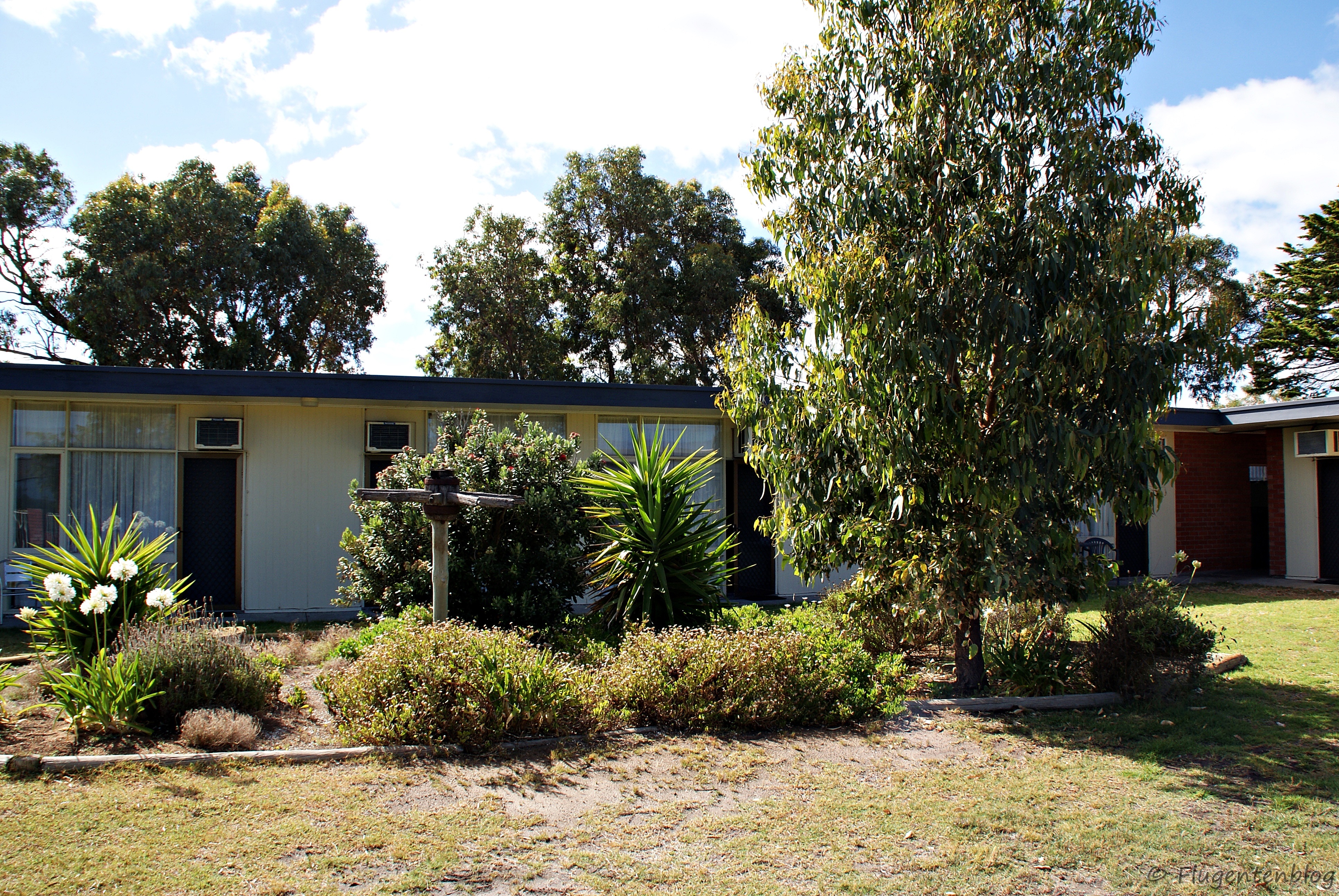 Goolwa: Goolwa Riverport Motel – Geräumiges Zimmer, dessen Hintereingang direkt in den Garten mit Grillplatz und Blick auf einen Nebenarm des Goolwa River führt. Vor dem Motel befindet sich ein Park mit unzähligen wild lebenden Papageien – ein Erlebnis. Ein Tipp: nicht zu knapp auschecken – das wird genauestens kontrolliert.