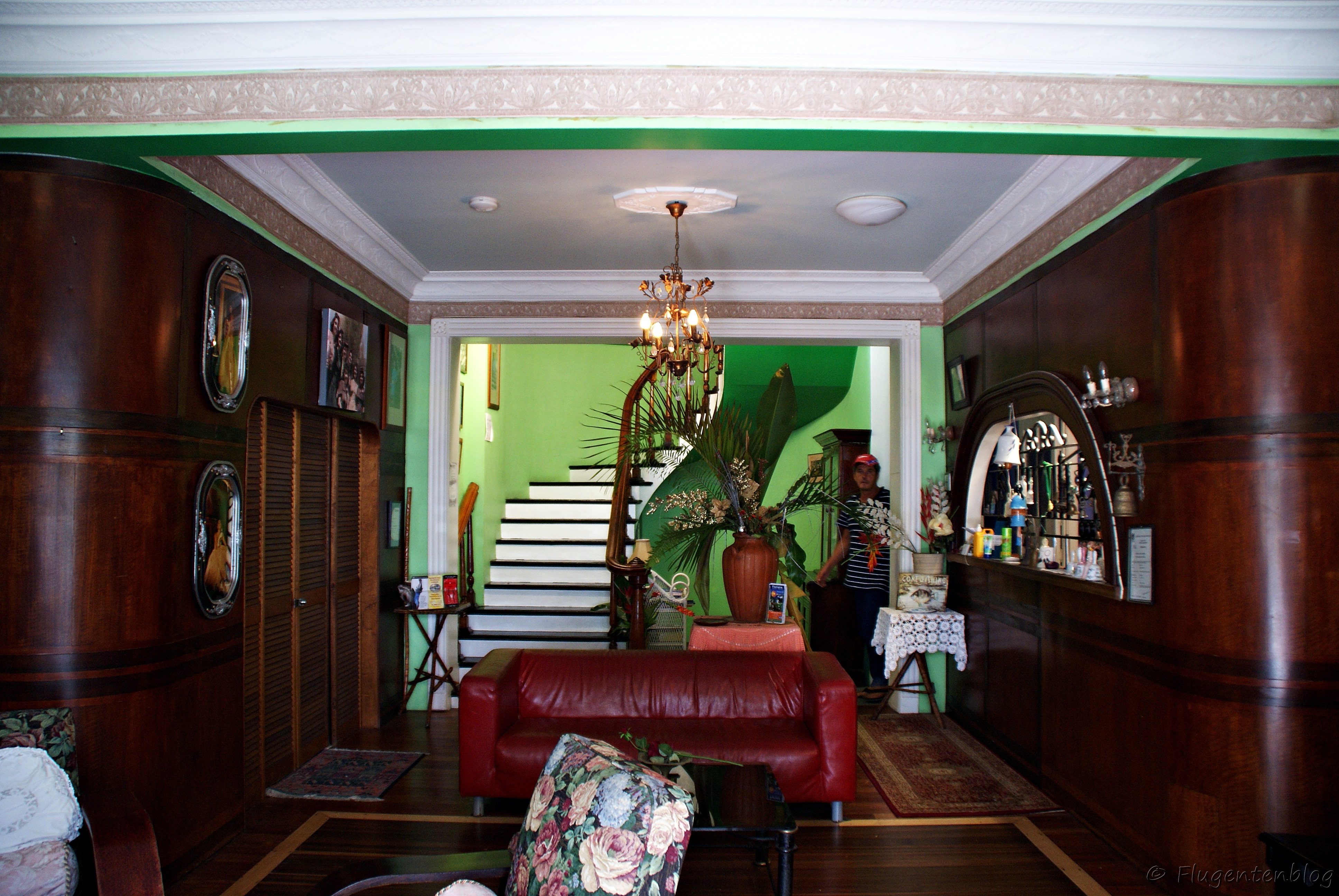 Cairns: Floriana Guest House – überall blühen Blumen überall :-) Ein kunterbuntes Haus mit Blick auf das Meer, etwas außerhalb des Zentrums, aber dieses ist leicht zu Fuß auf einem Weg entlang des Meeres erreichbar. Das Zimmer war eigentlich ein Mini-Apartment mit Küche=Bad und Duschkabine in einem Raum. Beim Hintereingang befindet sich ein kleiner Pool.