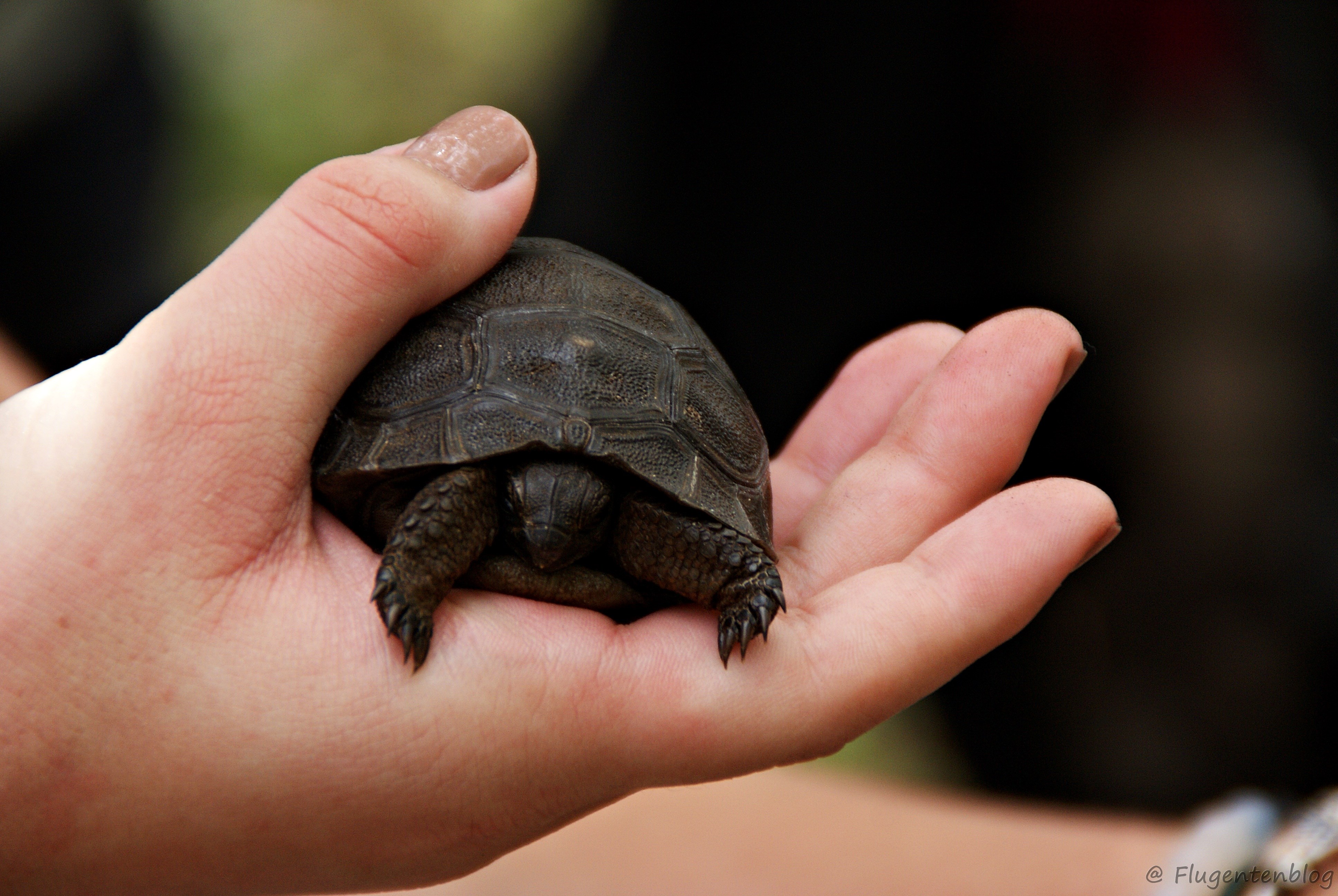 Auf der Insel angekommen beginnt der Spaziergang durch den Wald auf der Suche nach Flora und Fauna. Erste Station ist ein Gehege der Baby-Schildkröten und Flughunde. Dann gibt es allgemeine Infos zu den auf der Insel heimischen Tiere und Pflanzen, v.a. auch interessante Erklärungen zu den Landschildkröten. Wusstet ihr, dass der eigentliche harte Panzer der Schildkröten sehr sensible Punkte hat? Die erwachsenen Schildkröten leben frei auf der Insel, sodass man nie genau weiß, wo und wann sie Eier gelegt haben. Umso schöner war die Überraschung, als eine junge Dame aus unserer Gruppe im Dickicht eine frisch geschlüpfte Schildkröte entdeckte, die noch nicht registriert war.