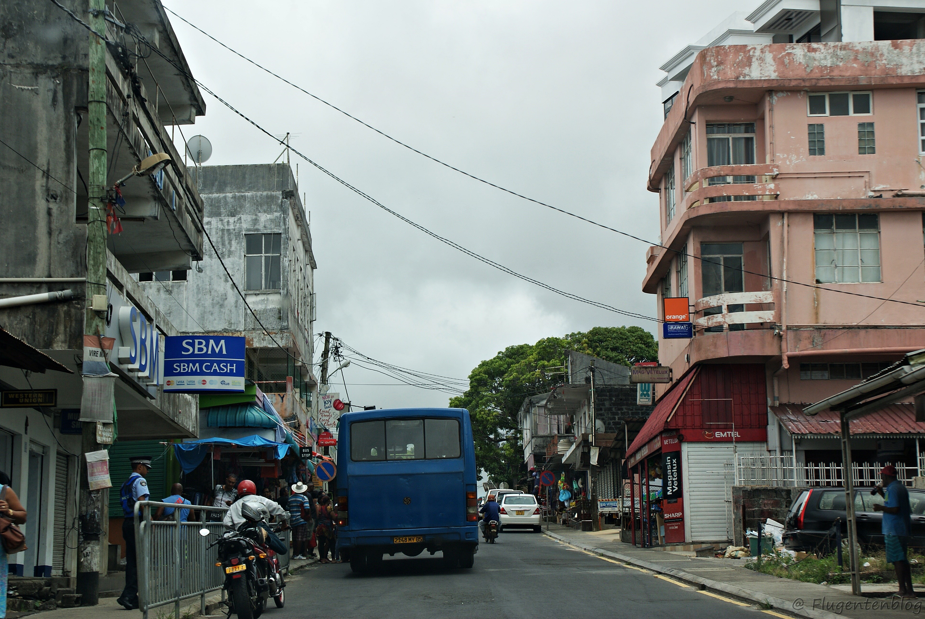 Straßenverkehr: Auf Mauritius gilt das Linksfahrgebot. Aber daran gewöhnt man sich schnell. Viele (Streuner-)Hunde, riskante Überholmanöver der Einheimischen, torkelnde Nachtschwärmer und am Straßenrand sitzende Bewohner jedoch machen das Autofahren zu einem Nervenkrimi. Die Straßen selbst sind größtenteils in einem sehr guten Zustand. Wer ohne Mietauto unterwegs ist, kann entweder Taxis nehmen oder die zahlreichen Busse benützen. Aufgrund eines eigenen Vehikels habe ich beides nicht probiert. Busse gibt es auf der Insel aber genug – zumindest kann ich mich nicht erinnern, jemals zuvor so viele Busse auf einen Haufen gesehen zu haben wie am Busbahnhof in Port Louis.