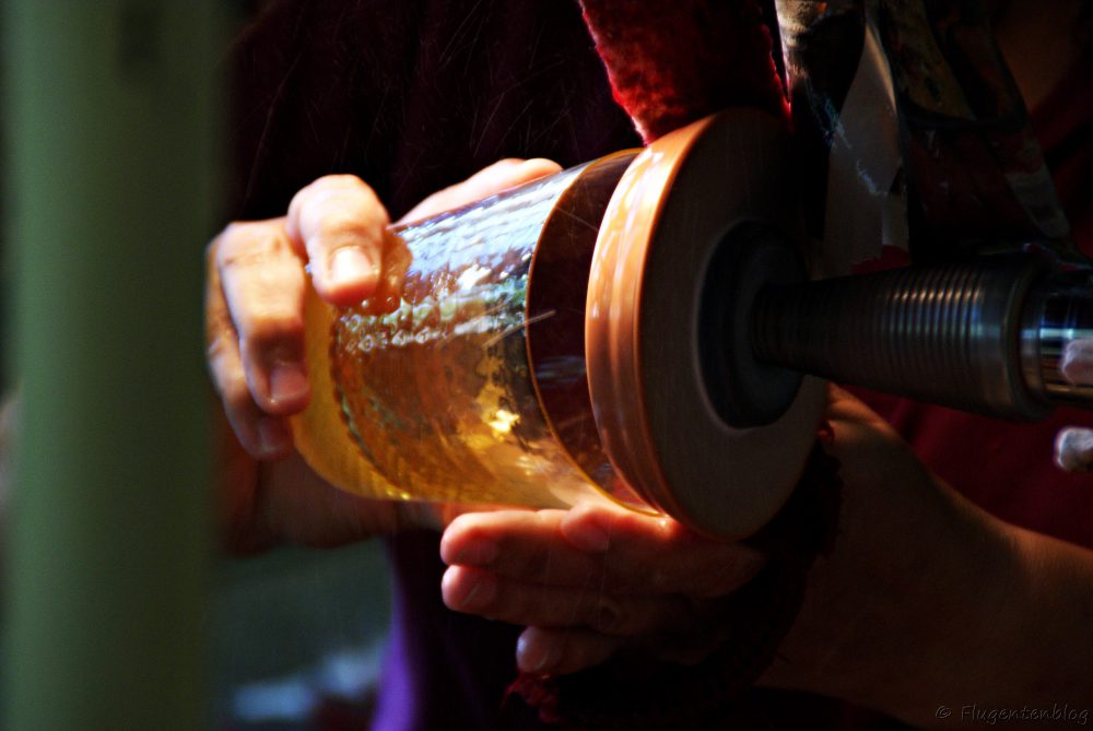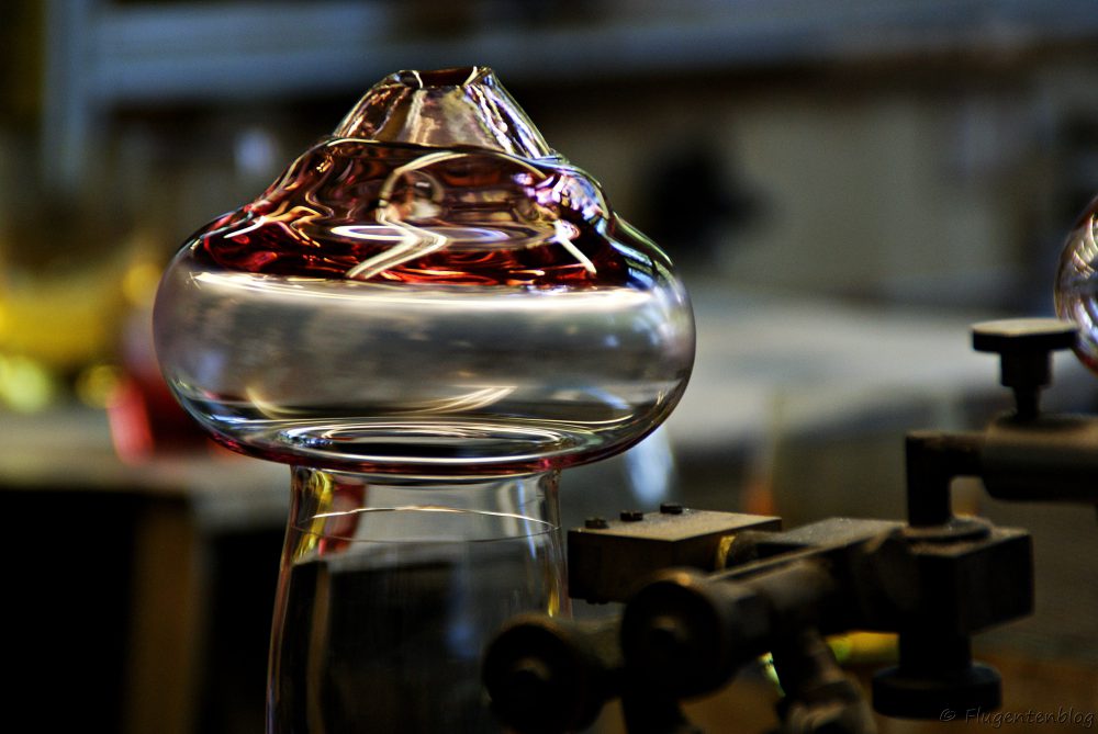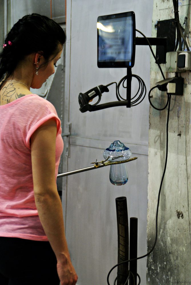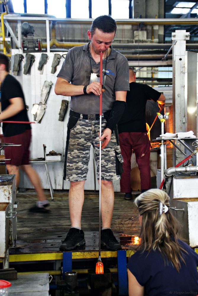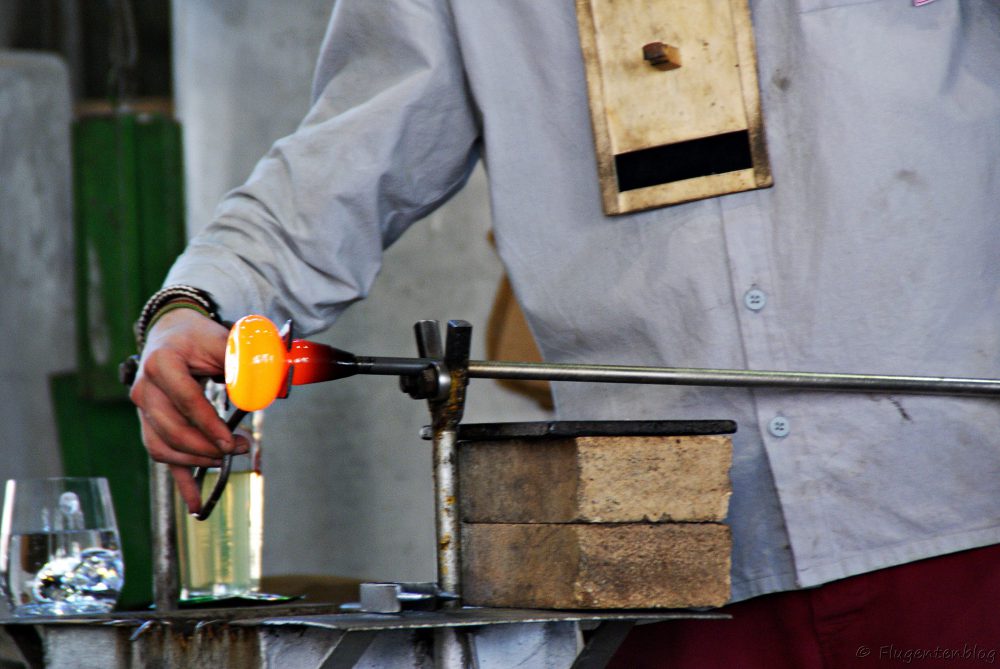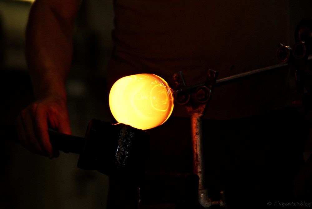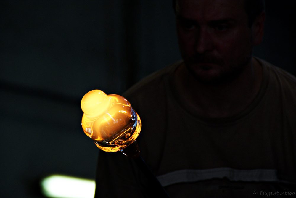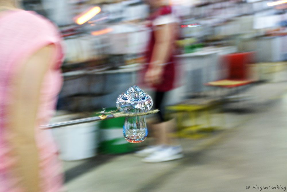 Anschließend gibt es noch etwas Herstellungs-Theorie, bevor man in die Glashütte eintritt, wo die Glasbläser auf einem Podest ihr Handwerk verrichten. Unglaublich, in welcher Geschwindigkeit die Arbeiter aus einem heißen Klumpen Irgendwas derartige Kunstwerke formen!