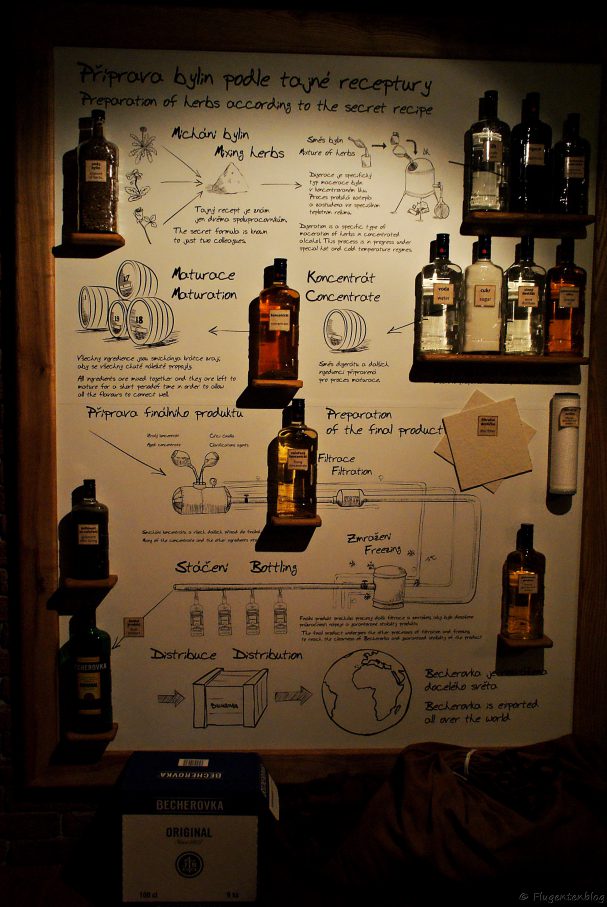 Carlsbad English Bitter, Karlsbader Becherbitter, Karlsbader Becherbitterbonbons in der Flasche, Becherovka – der Name hat sich verändert, das Rezept ist auch fast 210 Jahre später immer noch dasselbe. Die genaue Mixtur kennen nur zwei Personen im Unternehmen, aber im Rahmen einer Führung durch das Jan-Becher-Museum in Karlsbad erhält man einen Einblick in die Produktion des auch „Tschechisches Tafelsilber“ genannten Kräuterlikörs. Eine in Stoffsäcken gefüllte Kräutermischung wird mehrere Tage in Alkohol und aromatischen Ölen getränkt, später kommen Zucker und Karlsbader Wasser dazu. Die gesamte Mischung bekommt dann etwas Zeit, in Eichenfässern zu dem heranzureifen, was es letztendlich ist – ein sogar mir schmeckender Kräuterlikör.