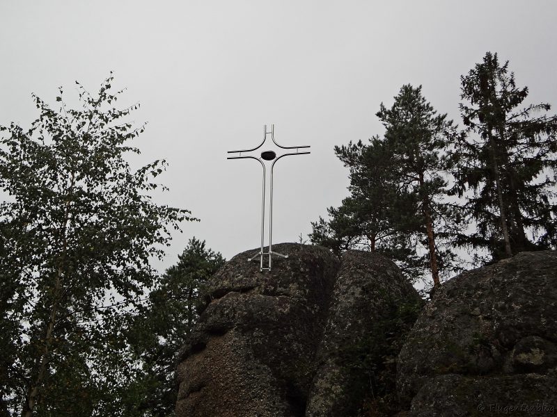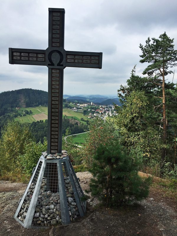 Nach einer Einkehr in der Taverne von Prandegg mache ich mich nach einem kurzen Regenschauer erneut auf dem Weg. Es geht runter ins Tal und wieder rauf auf den Herzogreither Berg. Station 3 ist erreicht. Eine kurze Kletterpartie belohnt mich mit einem wunderbaren Rundblick. Hier stand einmal eine Holzburg. Das Kreuz wurde von einer Bauernfamilie zum Dank dafür errichtet, dass die Bäuerin einen Sturz vom Felsen fast unverletzt überlebte.