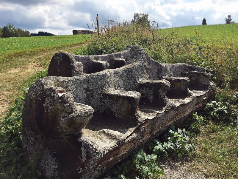 Nach der Sommerrodelbahn geht es steil bergauf und am Herrgottsitz angekommen zeigt mein rechtes Knie erste Ermüdungserscheinungen. Ich ignoriere es und verweile an Station 2 nur kurz. Nachdem Gott die Welt erschaffen hat, soll er sich auf diesem Felsen ausgeruht haben – eine kleine Mulde auf dem Felsen ist Zeugnis dieser Legende. Ob mein Po in die Gesäßmulde von Gott passt, teste ich nicht; meine letzte Pause ist erst wenige Minuten her.