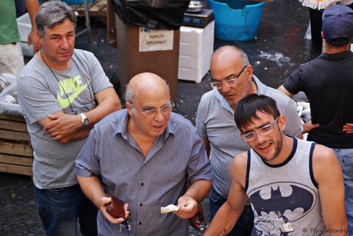 „Pisci freschi! Pisci freschi!“ Nicht nur für Fisch-Fans ein Erlebnis. Hier wird um den besten Preis gefeilscht, Fische aller Art werden angeboten und Shrimps im Akkord gepult. Den besten Überblick hat man vom Piazza del Duomo über die Fontana dell’Amenano (Acqua a linzolu) kommend. Oben beim Stiegengeländer einen guten Platz suchen und staunen. Ich hätte hier Stunden stehen und dem Markttreiben zusehen können. Keine Sorge, der Markt findet im Freien statt, der Geruch ist folglich selbst bei großer Hitze erträglich. Früh kommen, denn gegen Mittag kehrt hier langsam wieder Ruhe ein. In den Gassen rund um den Piazza di Benedetto gibt es noch weitere Marktstände u.a. mit Obst, Gemüse und Gewürzen. Die grüne Gemüse-Stange ist übrigens eine Zucchini …