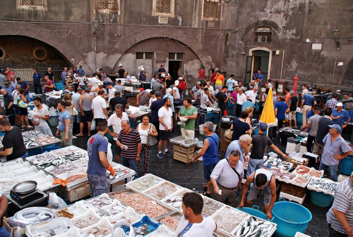 „Pisci freschi! Pisci freschi!“ Nicht nur für Fisch-Fans ein Erlebnis. Hier wird um den besten Preis gefeilscht, Fische aller Art werden angeboten und Shrimps im Akkord gepult. Den besten Überblick hat man vom Piazza del Duomo über die Fontana dell’Amenano (Acqua a linzolu) kommend. Oben beim Stiegengeländer einen guten Platz suchen und staunen. Ich hätte hier Stunden stehen und dem Markttreiben zusehen können. Keine Sorge, der Markt findet im Freien statt, der Geruch ist folglich selbst bei großer Hitze erträglich. Früh kommen, denn gegen Mittag kehrt hier langsam wieder Ruhe ein. In den Gassen rund um den Piazza di Benedetto gibt es noch weitere Marktstände u.a. mit Obst, Gemüse und Gewürzen. Die grüne Gemüse-Stange ist übrigens eine Zucchini …