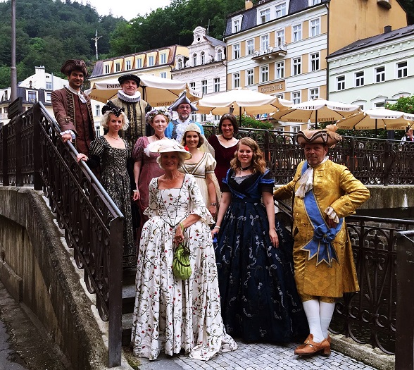 Vergangenes Jahr gab es im Rahmen des Mattoni Karnevals in Karlsbad auch einen historischen Kostümball. Vom Prager Filmstudio Barrandov mit tollen Kostümen ausgestattet begaben wir uns voller Erwartungen in das Grandhotel Ambassador. Leider erinnerte der Ball mehr an ein Faschingsgschnas als an einen historischen Kostümball. Der Saal wäre toll gewesen, darin tummelten sich jedoch zu Popmusik tanzende Marienkäfer, Bienen und Clowns. Der Eröffnungssong war ‚YMCA‘ von Village People. Der Wiener Opernball war es jedenfalls nicht. Wie auch immer, lustig war es trotzdem. Und vielleicht werde ich ja einmal zum ‚Karlsbader Wochenende‘ eingeladen – dabei handelt es sich um einen jährlich in Karlsbad stattfinden Kostümball der edleren Art. Allerdings darf man dort nur mit höchstpersönlicher Einladung des Gastgebers hinein. Falls es mit dem ‚Karlsbader Wochende‘ nichts wird, gibt es einige andere Veranstaltungen, die Grund für einen Karlsbad-Besuch sein können. So wurde beispielsweise vor ein paar Tagen ein Marathon durchgeführt, das berühmte Internationale Filmfestival von Karlsbad findet heuer vom 30.06. bis 08.07. statt und am 06./07.10.2017 wird ein Festival für auf Reisen spezialisierte Filme veranstaltet; um nur ein paar der Highlights zu nennen.