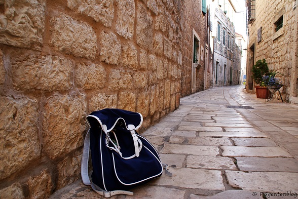 Federleicht kommt er daher, der Kamarg. Mit ca. 420 Gramm laut Küchenwaage ist er wirklich kein Schwergewicht. Mit einer Größe von 30 x 34 x 12 cm ist der Kamarg jetzt auch nicht gerade der allergrößte in der Rucksack-Familie. Aber wie heißt es schön: „Klein, aber oho.“ Im Kamarg lässt sich so Einiges verstauen – zB ein 15-Zoll-Notebook, Proviant für eine Wanderung oder die Dinge, die man für einen Wochenend-Trip ins Warme benötigt. Der Rucksack zog mit winzigen Fusseln bei mir ein – die kommen wohl von den Lederriemen. Aber etwas abgeklopft und mit dem Fusslroller massiert strahlte er blitzblank in einem satten Blau. Mit den weißen Lederriemen und Abnähten würde er perfekt nach Griechenland passen. Dorthin wird er mich zwar auch begleiten dürfen, aber erstmals ging es für mich und den Kamarg nach Kroatien. Ob als Handgepäck im Flieger, als Rucksack für eine kleine Bergwanderung, als Begleitung beim Lebensmitteleinkauf oder beim Erkundungstrip durch die kleinen Städte und Dörfer Kroatiens – der Kamarg wurde von mir auf Herz und Nieren, ähm, Leder und Canvasstoff, getestet. Eins gleich vorweg: er hat den Test mit einer Eins bestanden!