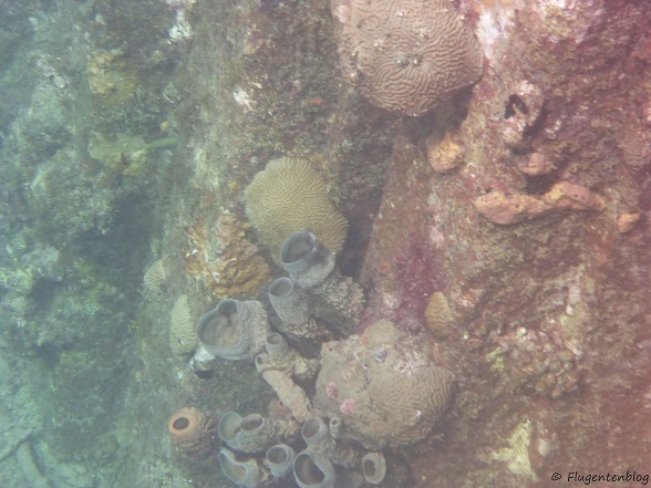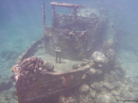 Einen ersten Vorgeschmack darauf habe ich auf Curaçao in der Caracasbaai erhalten. Dort bietet sich die Möglichkeit, mit der bloßen Schnorchelausrüstung einen von Korallen überwucherten und von Fischen rege besuchten gesunkenen Schlepper zu entdecken. Seit über 30 Jahren liegt das Wrack in nur 5 m Tiefe in Küstennähe und lässt sich entweder im Rahmen einer Bootstour – oder noch einfacher und vor allem günstiger – auf eigene Faust erschnorcheln. Die Straße dorthin führt am Fort Beekenburg vorbei und ist nicht die allerbeste, aber auch ohne Jeep befahrbar. Am Ende befindet sich eine kleine Bar, dort den Strand entlang bis an sein linkes Ende gehen. Im Meer dann links an den Felsen entlang schnorcheln und schon befindet sich zur rechten Hand das Wrack.