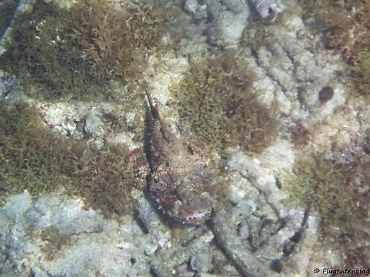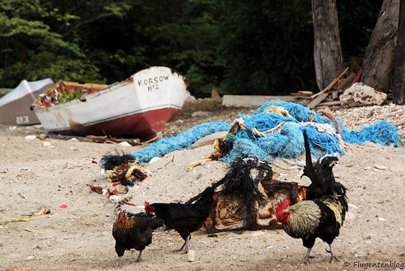 Der Playa Grandi gehört sicher nicht zu diesen Postkartenmotiven, auch wenn er so ähnlich klingt wie der Playa Kenepa Grandi. Im Gegenteil, grober Strand, wild herumlaufende Hühner und Arbeiter, die direkt am Meer die Fische auslösen. Nichtsdestotrotz oder gerade deswegen lohnt sich ein Besuch des Playa Grandi oder besser gesagt, des Meeres an dieser Stelle. Zugegeben, Playa Grandi ist jetzt nicht gerade der Schnorchel-Hotspot auf Curaçao, aber eigentlich bin ich ohnedies nur wegen einem Meeresbewohner hier. Die Innereien der Fische werden wieder ins Meer geworfen, dies lockt zum einen riesige Fischschwärme und zum anderen *trara* Meeresschildkröten an. Wer also diese faszinierenden Meeresbewohner einmal in freier Natur und aus nächster Nähe sehen möchte und das auch noch kostenlos, sollte es sich nicht entgehen lassen, hier einmal zu schnorcheln oder zu tauchen. Außerdem fand ich es spannend, den Fischern bei ihrer Arbeit zuzusehen, aber das ist wohl nicht jedermanns Sache. Die gefangenen Fische können übrigens (gegen Vorbestellung) direkt am Strand erworben werden.