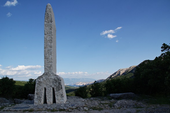 Was hier aussieht wie eine Gabel ist das ‚Große Az‘. Der erste Buchstabe des glagolitischen Alphabetes markiert den Beginn des Glagolitischen Pfades von Baška. Glagoliza ist die älteste Schrift der slawischen Völker. Wer in und um Baška unterwegs ist, wird immer wieder einzelne Steindenkmäler finden, welche die einzelnen Buchstaben von Glagoliza darstellen.