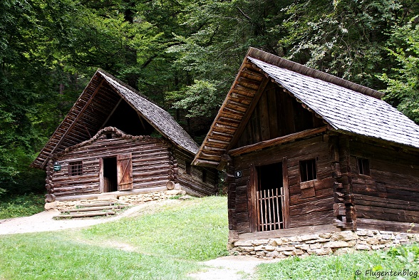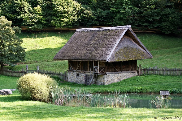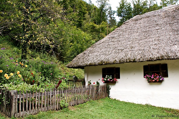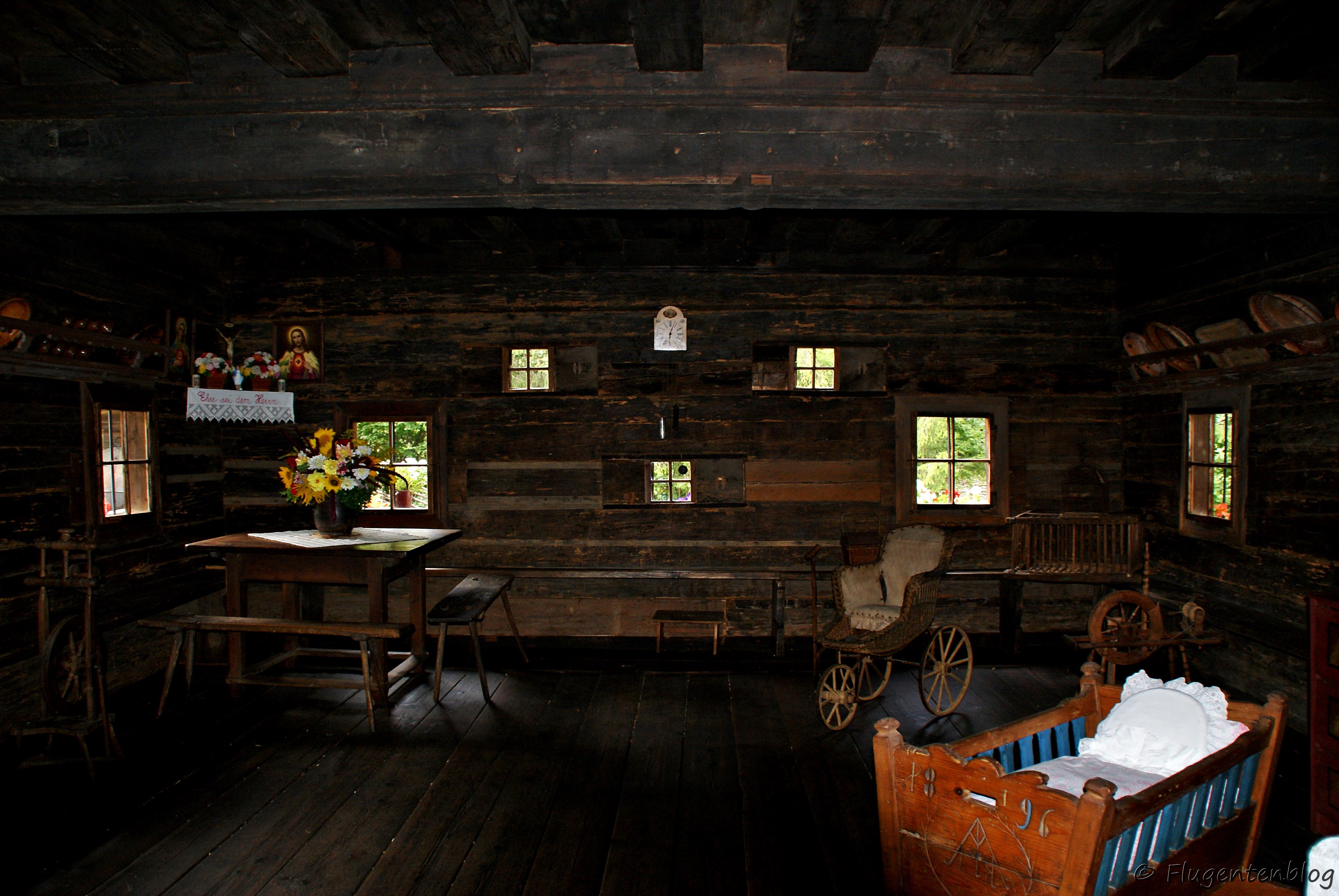 Er ist eines von 76 Originalen des Museums, die von ihrem ursprünglichen Standort ins Freilichtmuseum transloziert (also abgebaut und hier wieder neu aufgebaut) wurden. Manche mussten einer Straße, einem Stausee oder aus sonstigen Gründen weichen und haben im Freilichtmuseum eine neue Bestimmung erhalten. Alle anderen Objekte sind entweder originalgetreue Nachbauten oder wurden aufgrund historischer Aufzeichnungen bzw. mündlicher Überlieferungen rekonstruiert. Dabei wurde offenbar darauf geachtet, dass sich die Gebäude in die Landschaft einfügen, denn ich komme mir vor wie in einem Dorf irgendwo auf dem Land. Gäbe es nicht die Hinweistafeln, würde ich glatt vergessen, dass ich mich in einem Museum befinde. Auch bei der Innenausstattung wurde viel Wert auf Authentizität gelegt – die Betten sind gemacht, Blumen stehen auf dem Tisch und manchmal ist sogar der Ofen eingeheizt. Wann kommt der Bauer eigentlich vom Feld zurück?