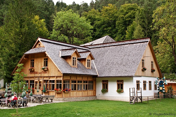 Uff, nach dem Unterricht und dem Kirchenbesuch benötige ich eine Pause. Natürlich darf in keinem Dorf ein Wirtshaus fehlen und so gibt es seit 2016 im Freilichtmuseum Stübing das Gasthaus „Zum Göller“, welches früher am Lahnsattel in Niederösterreich stand. Heute lädt das Wirtshaus mitten im Museumsgelände zu einer gemütlichen Einkehr mit Schmankerln aus ganz Österreich ein.