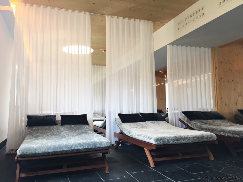 … sowie im kürzlich neu gestalteten 300 m² großen Himmelreich. Besonders kuschelig ist es dort in den vier Logen (Day Spa Suiten), welche nach den vier Elementen Wasser, Erde, Feuer und Luft eingerichtet sind. Diese Logen für den ganz exklusiven Ruhemoment können extra gebucht werden und kosten pro Tag € 92,– (für max. 2 Personen). Darin inkludiert ist eine samtige Kuschelliege, ein Balkon mit Panoramablick auf die Vulkania® Badelandschaft sowie ein Sortiment an Tee, Kaffee und Pralinen. Bei soviel Genuss darf natürlich der Champagner nicht fehlen! Ich durfte die Luft-Loge testen und was soll ich sagen: es war einfach himmlisch!