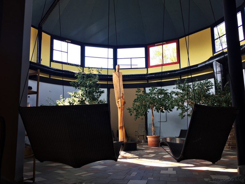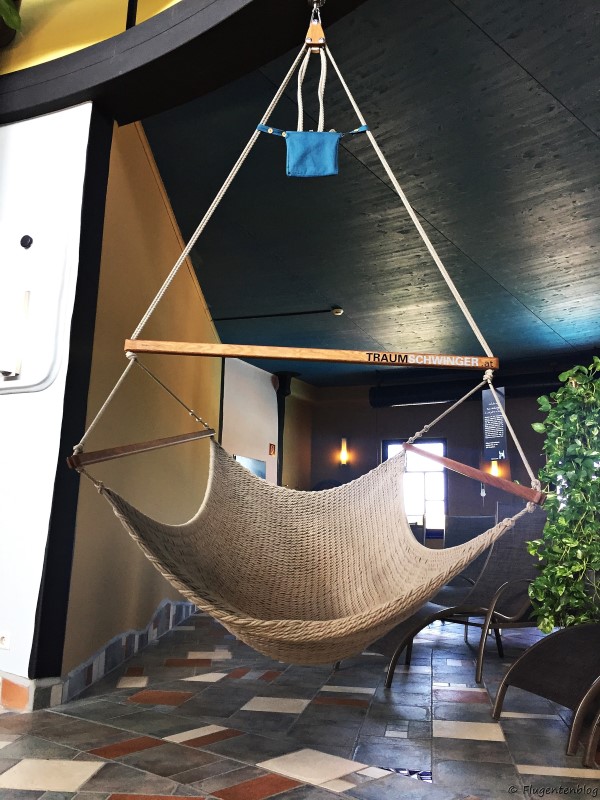 Im Wasser plantschen macht müde und so braucht selbst die Flugente mal ein kleines Päuschen. Besonders gut entspannen lässt es sich im Raum der Stille mit Traumschwingern und sonstigen Ruhemöbeln ….