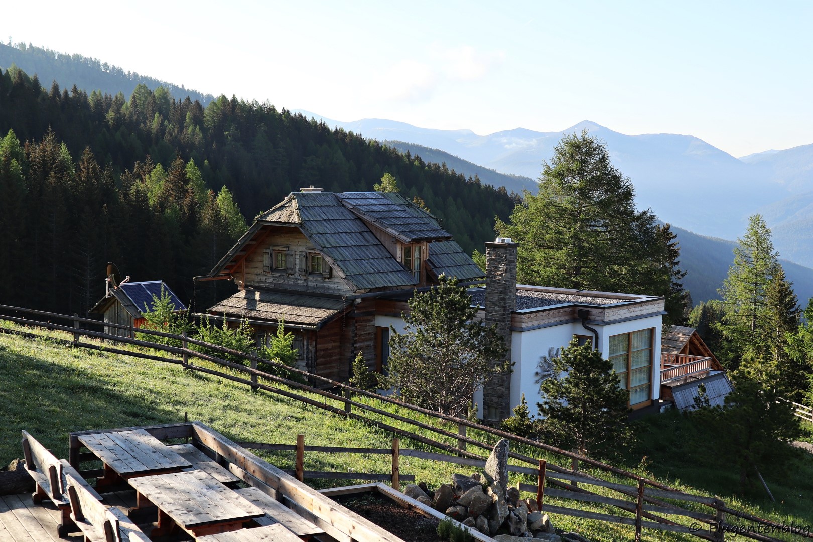 Am nächsten Morgen war der Himmel wieder klar, die ersten Sonnenstrahlen zeigten sich bereits. Während über dem Tal noch kleine Nebelschwaden hingen, genoss ich die frische Almluft und das traumhafte Panorama vom Balkon. Was für eine Aussicht!