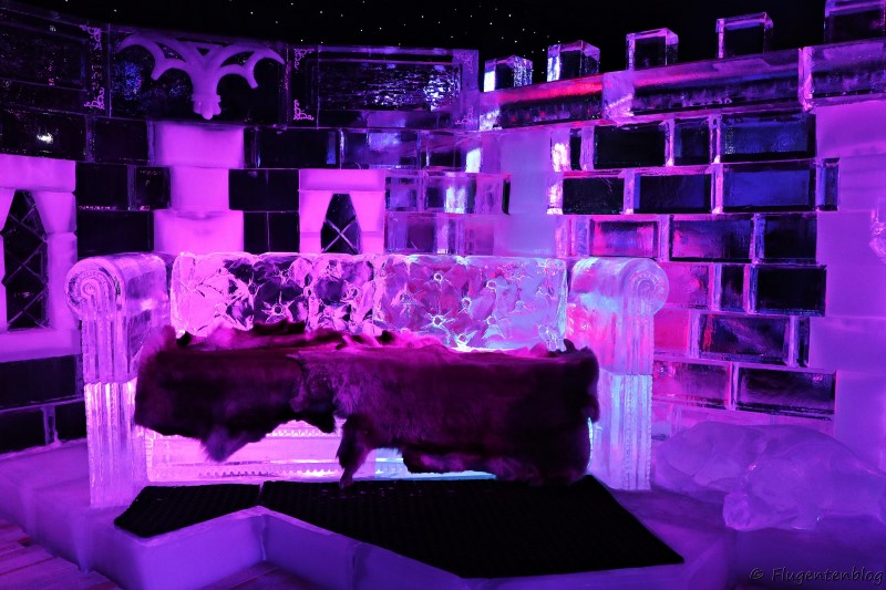 Ein Bett und eine Couch (aus Eis versteht sich) laden mit Fellen bedeckt zum Ausruhen ein. Ich bin aber gerade nicht müde und so stürze ich mich lieber wagemutig die Eisrutsche hinunter. Weit komme ich nicht, meine Jeans ist eine Spaßbremse .. im wahrsten Sinne des Wortes und so muss ich etwas nachhelfen, um das Ende der eisigen Rutsche zu erreichen.