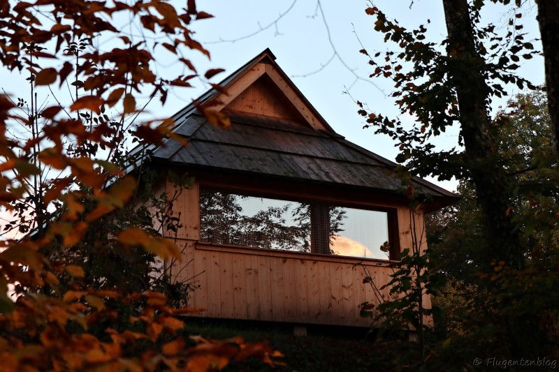 Neben den großen 4+1 Hütten („Wooden Cottage“) gibt es im Slovenia Eco Resort auch noch 2-Mann-Hütten („Glamping Hut“), welche aber über keine eigenen Sanitäreinrichtungen verfügen sondern sich in ein paar Metern Entfernung Gemeinschafts-Waschräume teilen. Dafür bietet ein Panoramafenster Ausblick auf die darunter gelegenen Wooden Cottages und das restliche Gelände.