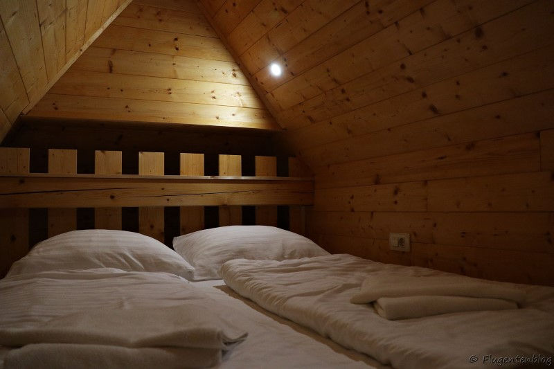 In den Wooden Cottages können jedenfalls vier Personen nächtigen, bei Bedarf kann noch ein Zusatzbett gestellt werden. Also, perfekt für einen Familienurlaub mit Selbstversorgerlaune! Ich durfte die Hütte ganz alleine testen. Tja, wer die Wahl hat, hat die Qual. Letzten Endes entschied ich mich, die Nacht im Obergeschoß, welches über eine steile Holzstiege erreichbar war, zu verbringen. Und was soll ich sagen, die Matratzen lagen zwar auf dem Boden, aber es war total gemütlich und die Holzschrägen sorgten für ein wohliges Flair. Ich sag‘ nur: harte ISO-Matte und beklemmender Schlafsack adé!