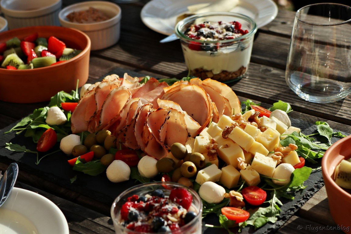 Am nächsten Morgen wartet bei strahlendem Sonnenschein ein üppig gedeckter Frühstück auf uns. Das Auge isst bekanntlich mit und wird hier pappsatt. Die Frühstückstafel ist optisch und geschmacklich ein Genuss – so lässt es sich wunderbar in den Tag starten und gestärkt die Umgebung erkunden (oder wieder faul im Whirlpool plantschen *g*).