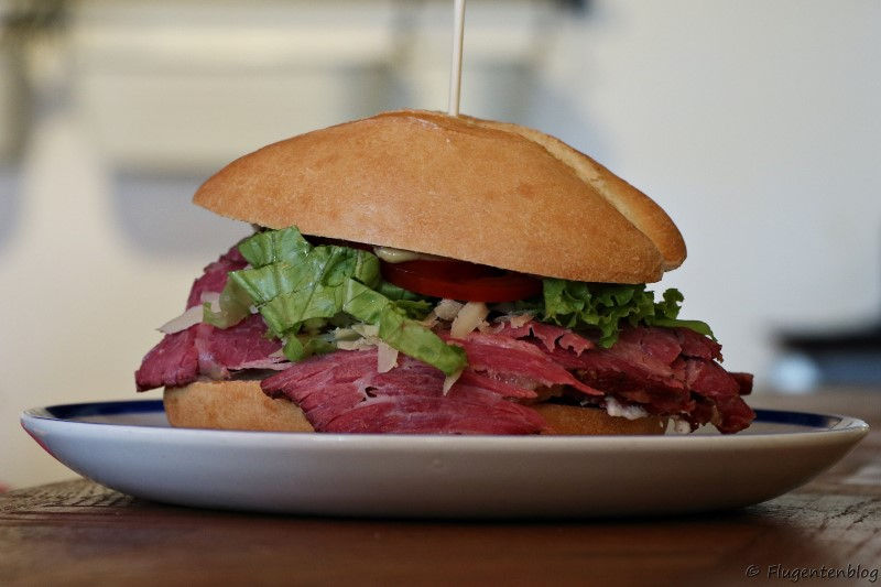 Spezialität des Hauses: Žemljica. Dahinter steckt ein Sandwich gefüllt mit Schweine- oder Rindfleisch, wobei diese Beschreibung fast eine Beleidigung ist. Das Brötchen ist frisch gebacken und das Fleisch wurde vier Tage lang entsalzen, dann einen Tag geräuchert und schließlich noch einen Tag lang gebacken. Gut Ding braucht Weile … das Ergebnis schmeckt jedoch himmlisch!