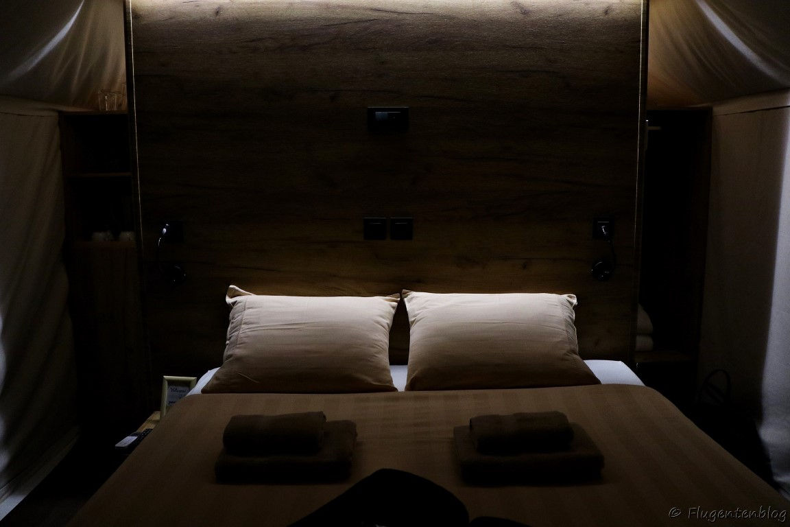 - So sieht es im 2-Bett-Zelt aus: rechts hinten ist ein kleiner Schrank. Hinter der Bettwand befindet sich das Bad.