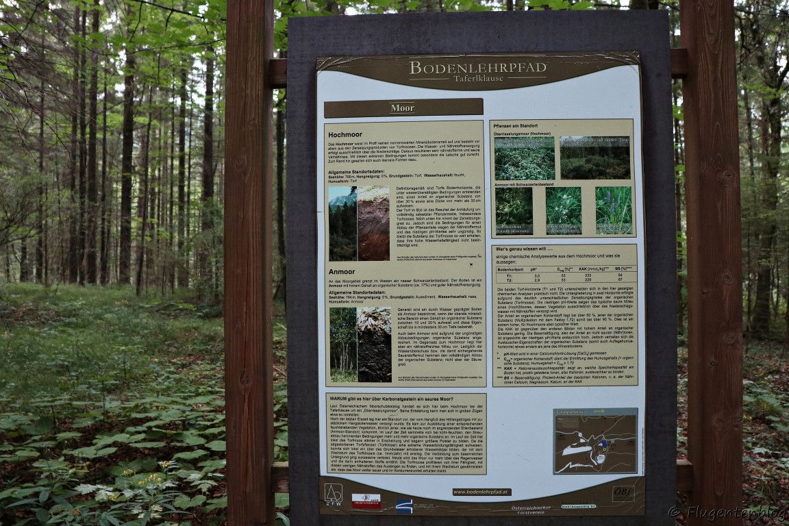 Wir treten tagtäglich den Boden mit unseren Füßen und das auch im übertragenen Sinne … wer achtet im Wald oder auch sonst genau auf den Boden und macht sich (außer im Biologieunterricht) Gedanken über seine Entstehung und Zusammensetzung? Rund um den 1,5 ha großen Taferlklaussee befinden sich zahlreiche informative Schautafeln, welche uns unter dem Motto „Bodenlehrpfad Taferlklaussee – Wir stehen drauf“ den Lebensraum Boden (wieder) ein Stückchen näher bringen. Zusätzlich zu den Schautafeln gibt es auch noch Audioguides, welche über die auf den Tafeln befindlichen QR-Codes abrufbar sind. Der Taferlklaussee ist im Übrigen ein Moorsee, der zunehmend verlandet. (Mehr Informationen zum Bodenlehrpfad)