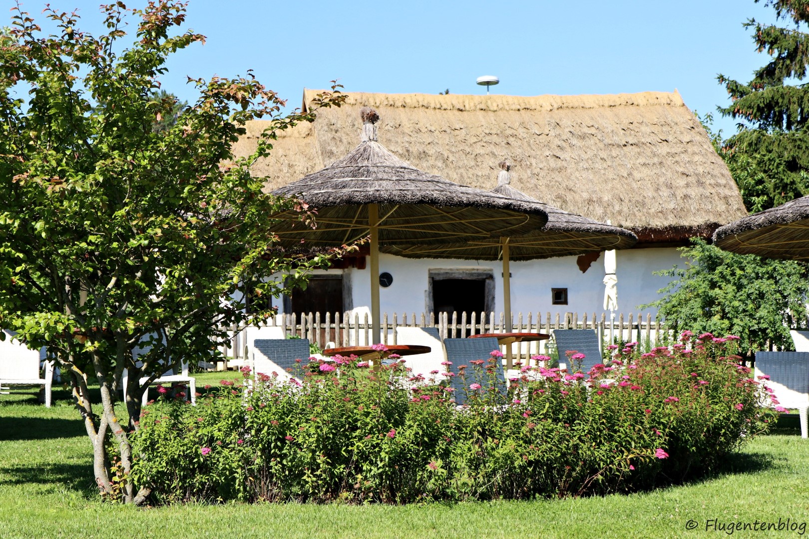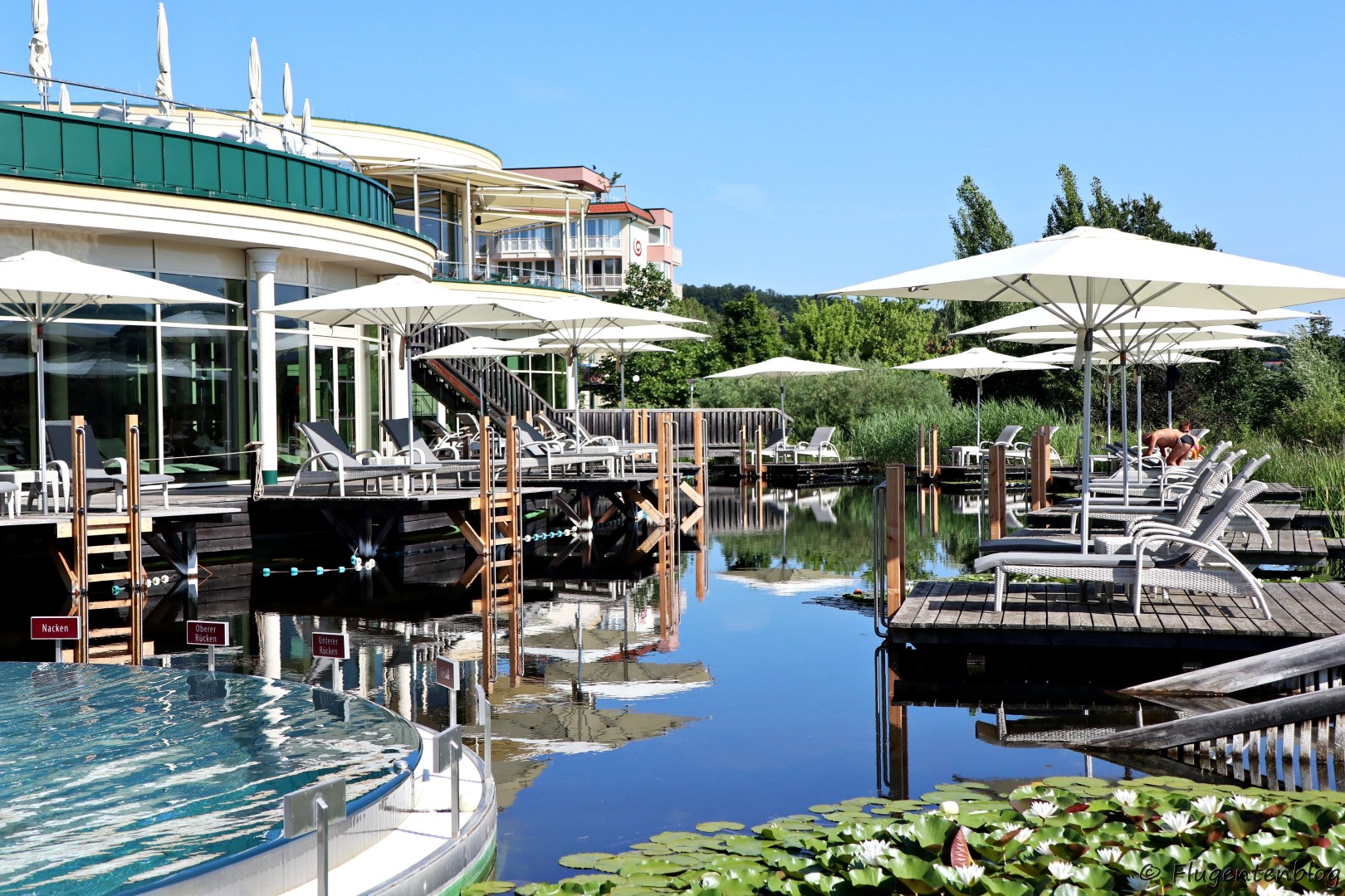 Mein Lieblingsplätzchen? Ganz klar … der 1.200 m² große Bio-Naturbadeteich. Ich habe ein besonders heißes Wochenende erwischt, weshalb ich am liebsten meine Bahnen im erfrischenden Naturbadeteich zog, dabei den Blick auf die Seerosen genoss und die Frösche beobachtete, die es sich auf den Seerosenblättern gemütlich gemacht hatten. Beim Teich befinden sich ein paar Romantikstege, welche gegen eine Extragebühr von € 15,– / Steg / Tag gebucht werden können. Wer es besonders gemütlich mag, kann vom Picknickkorb-Service (Wein, Mineral, Obst, pikante Schmankerl, Tageszeitung; € 28,–) Gebrauch machen. Im Winter bieten sich stattdessen die Day Spa Lounges an.