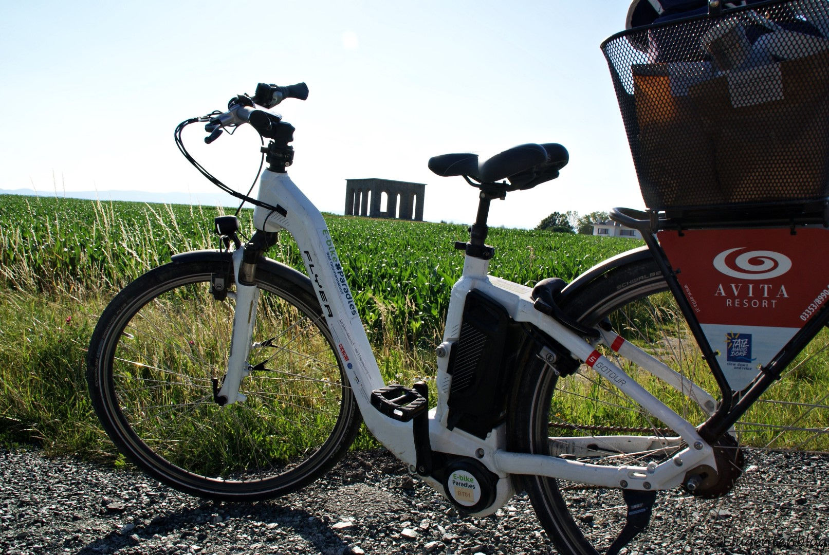 - Mit dem E-Bike auf Tour. Im Hintergrund: das große Anschlussdenkmal (Mahnmal) von Oberschützen.