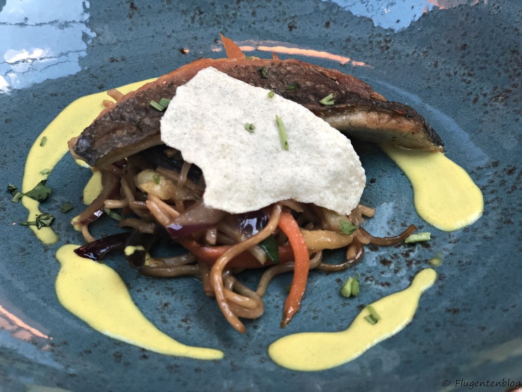 - Gebratenes Doraden-Filet mit Kokos-Currysauce, gebratenem Gemüse und Eiernudeln.