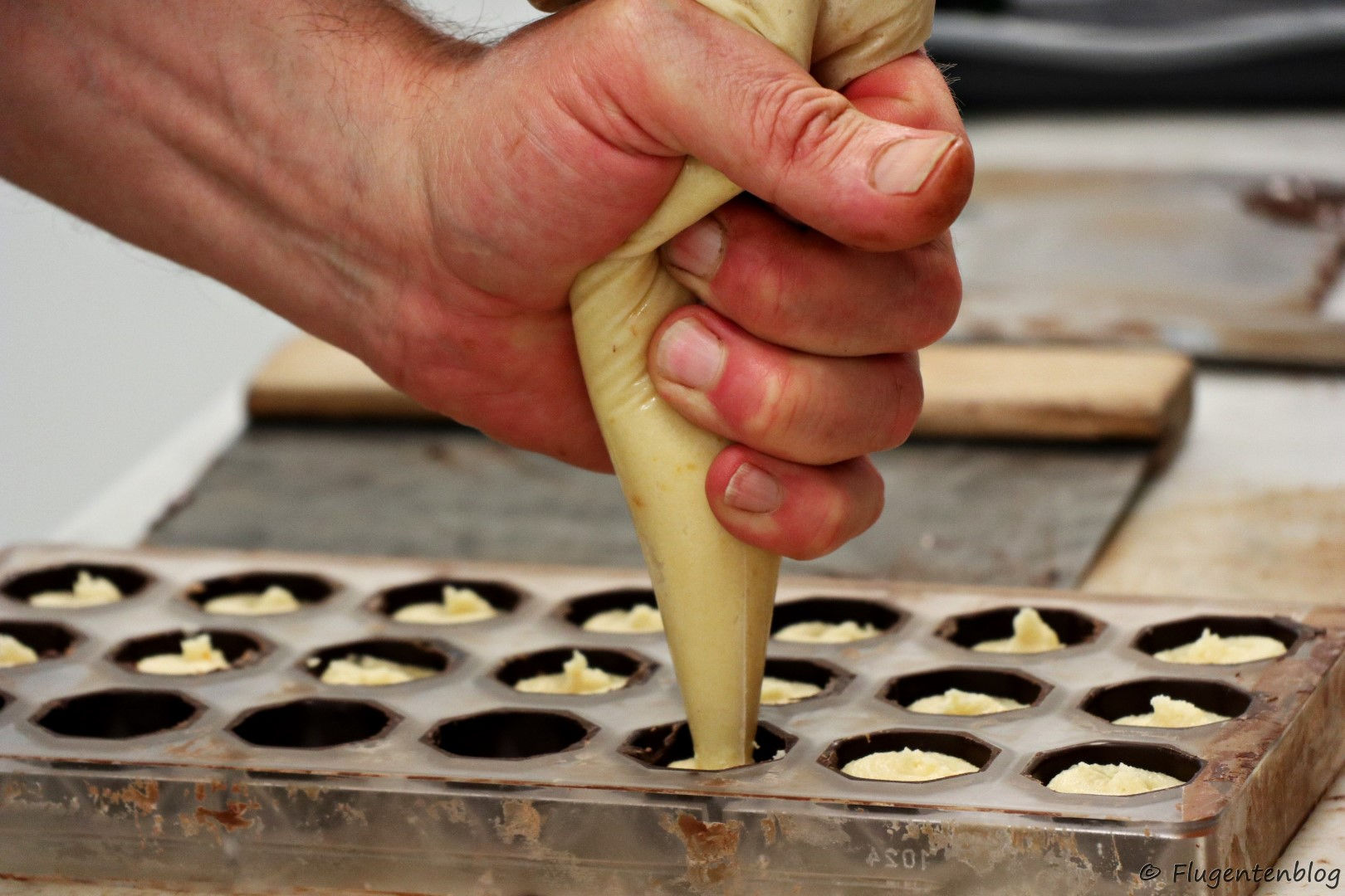 - Nachdem die überflüssige Schokolade abgetropft ist, wird das Marzipan eingefüllt.