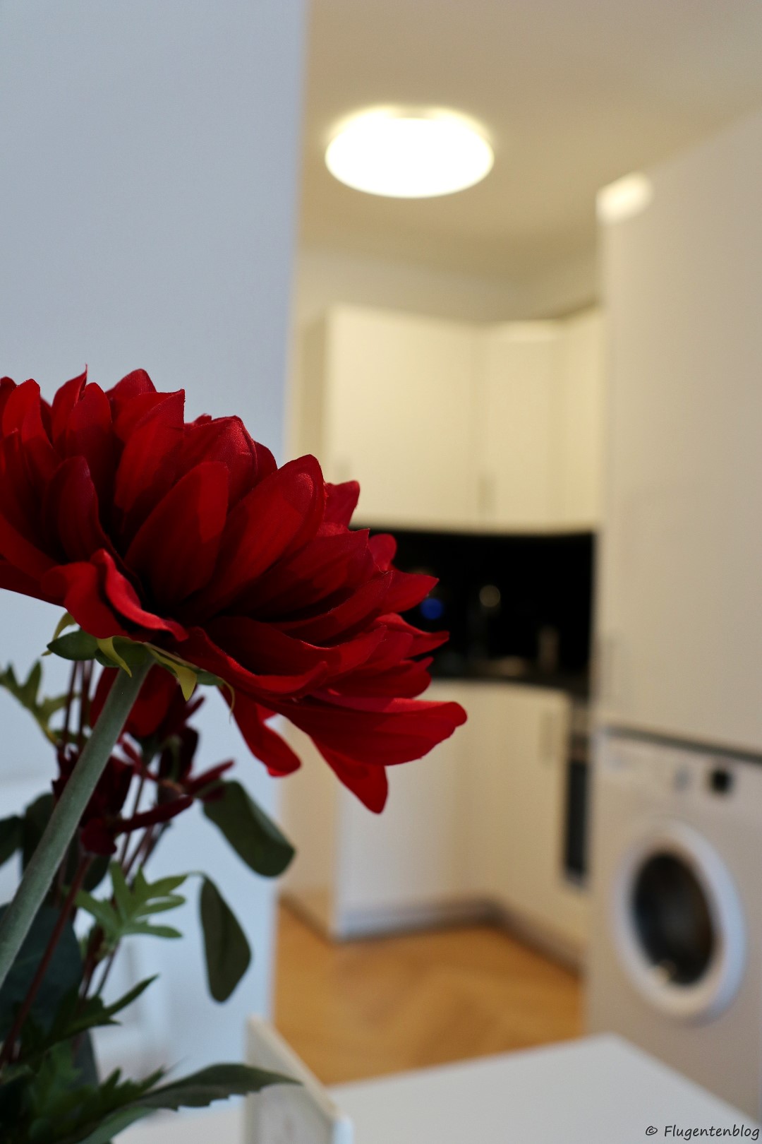Auch in der Küche fehlt es an nichts: Wasserkocher, Kaffeemaschine, Geschirrspüler, Kühlschrank, Feuerlöscher und Waschmaschine. Alles da. Wobei ich angesichts des restlichen Farbkonzepts mit rot-weiß-roten Häferl gerechnet hatte, aber die Farbe beeinträchtigt ja nicht die Funktion der Tassen :-)