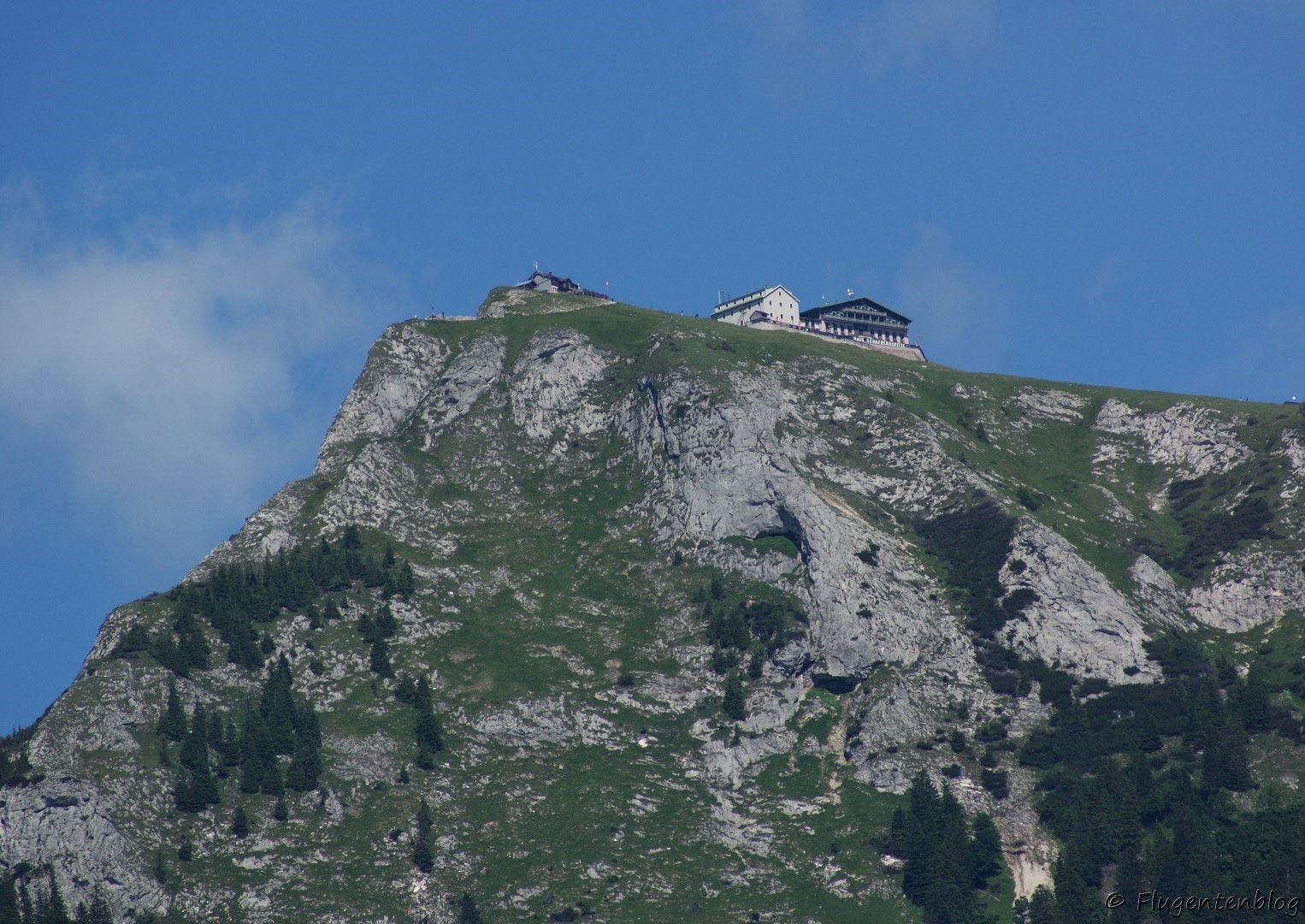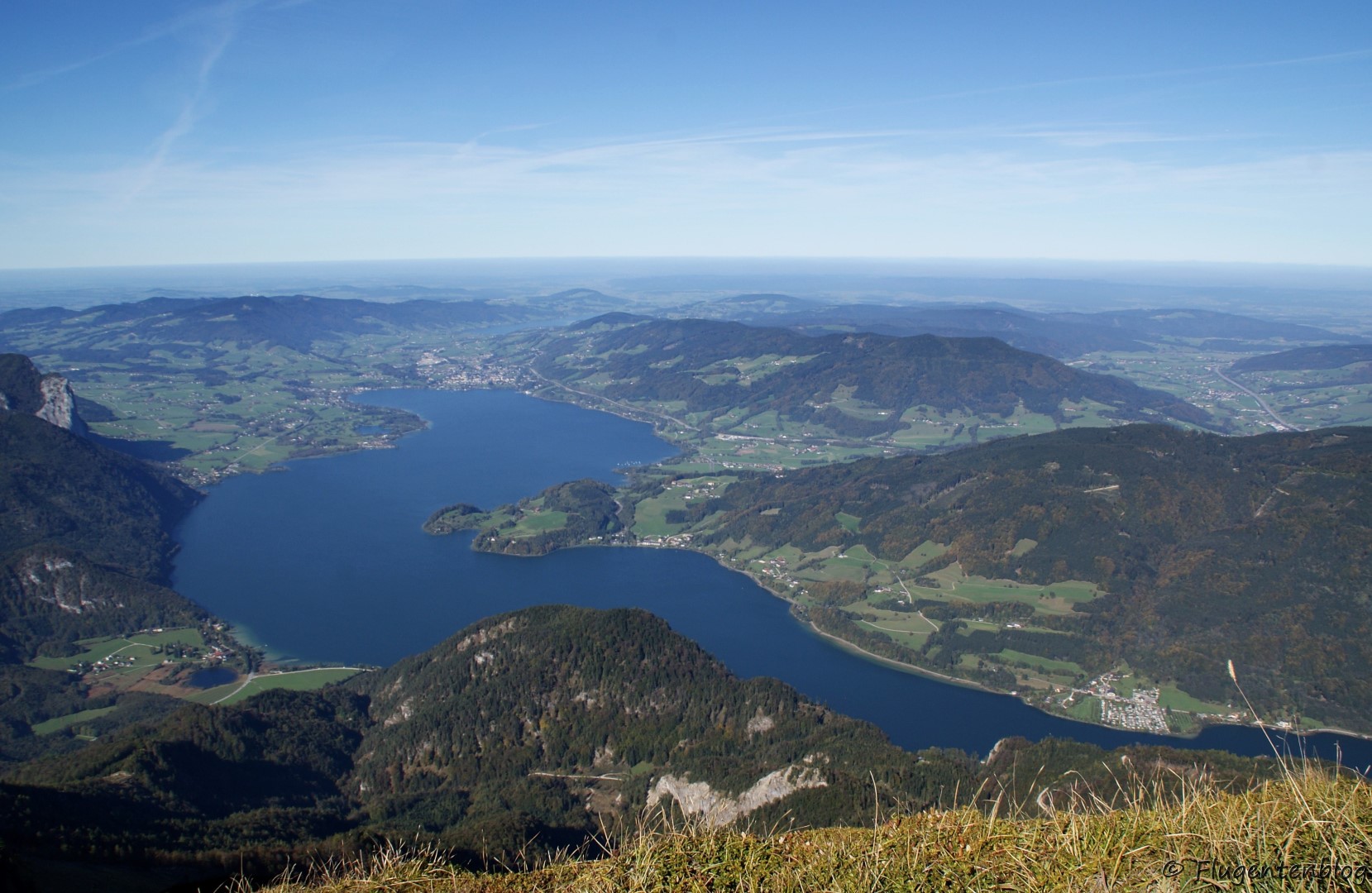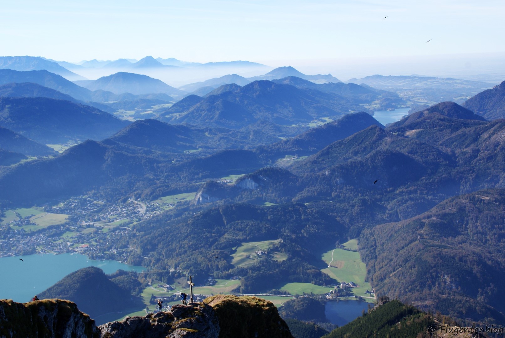 - Was für ein Ausblick! Links unten: das Gipfelkreuz der Schafbergspitze.